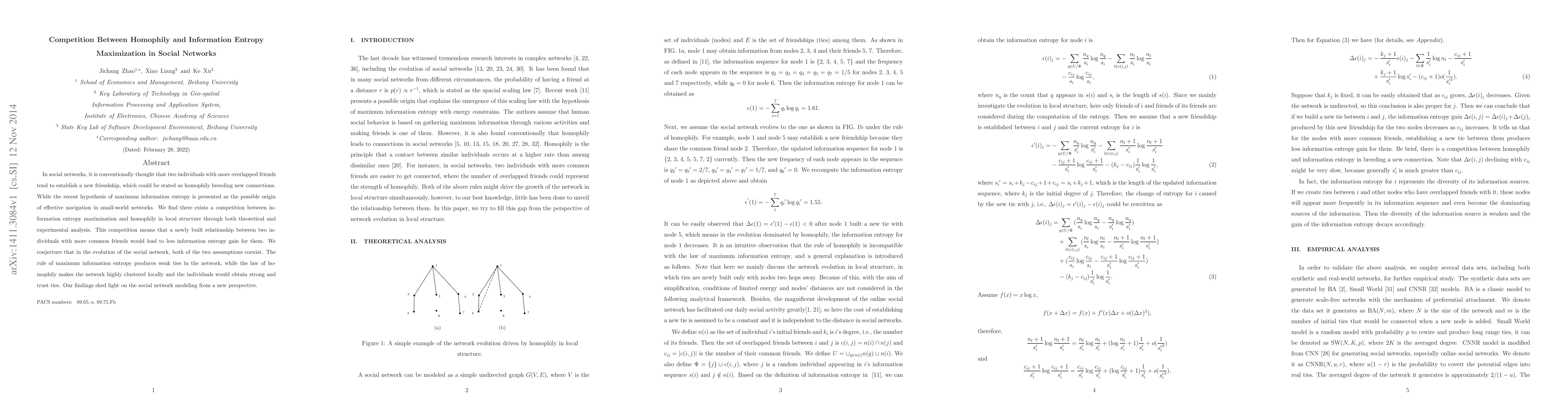 This paper explores the interplay between homophily and information entropy maximization in social networks, revealing a competition between these two principles. It concludes that while homophily fosters strong local clusters, information entropy maximization encourages the formation of weak ties, suggesting a dual dynamic in social network evolution.