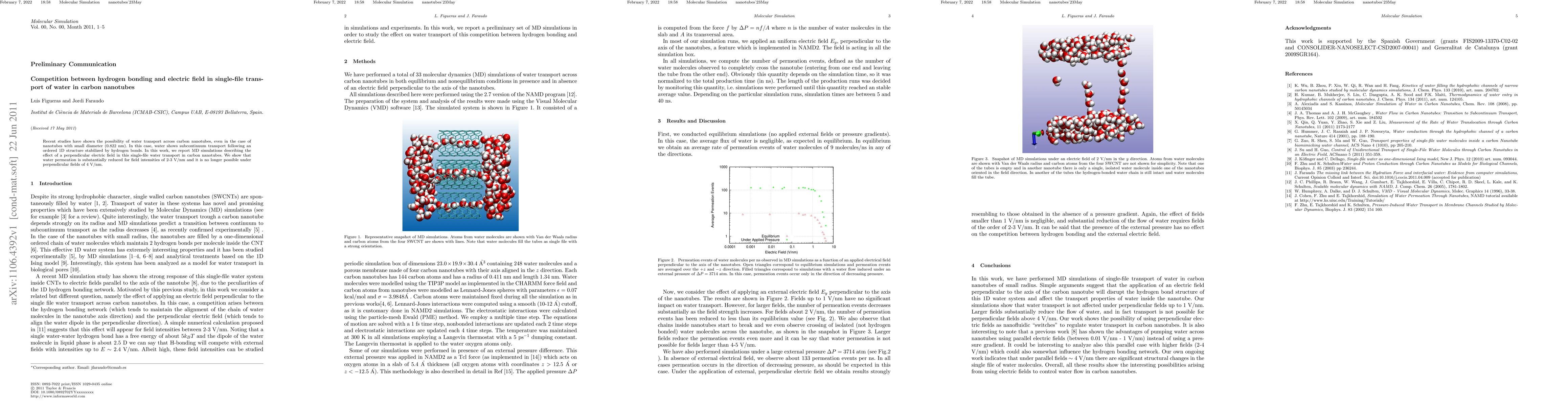 This study uses MD simulations to investigate how a perpendicular electric field affects the ordered, hydrogen bond-stabilized 1D transport of water through carbon nanotubes. It finds that water permeation significantly decreases with field intensities of 2-3 V/nm and is completely halted at 4 V/nm.