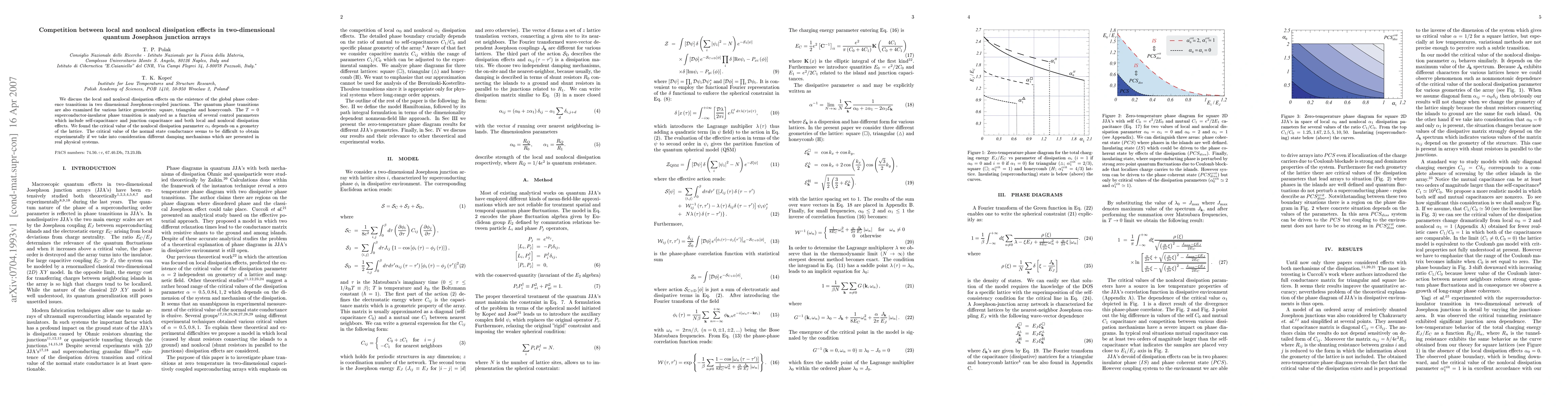 This paper investigates the interplay between local and nonlocal dissipation effects on phase coherence in two-dimensional Josephson junction arrays, examining quantum phase transitions across different lattice geometries. The study finds that the critical value for nonlocal dissipation varies with lattice geometry, while obtaining the critical value for normal state conductance remains experimentally challenging due to complex damping mechanisms.