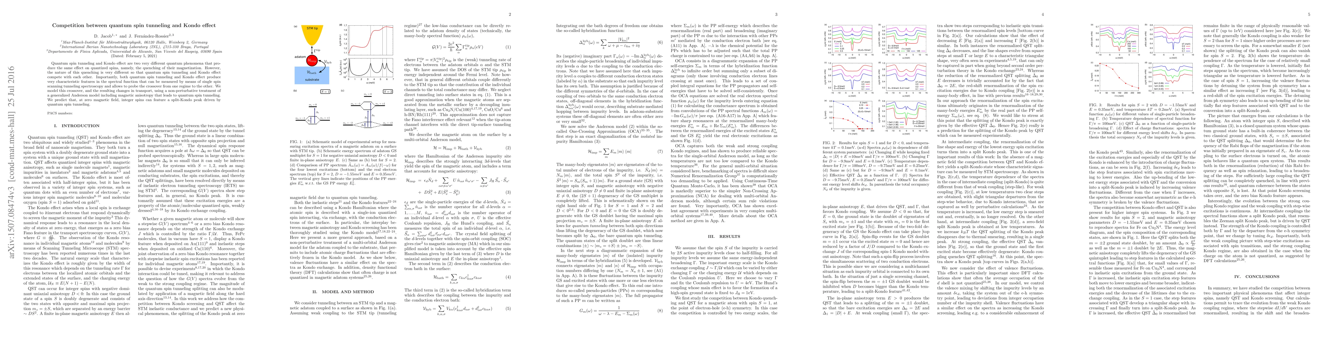 This paper investigates the competition between quantum spin tunneling (QST) and the Kondo effect, both of which quench the magnetization of quantized spins but through different mechanisms. The authors model the crossover between these phenomena using a non-perturbative approach and predict that integer spins may exhibit a split-Kondo peak driven by QST at zero magnetic field.