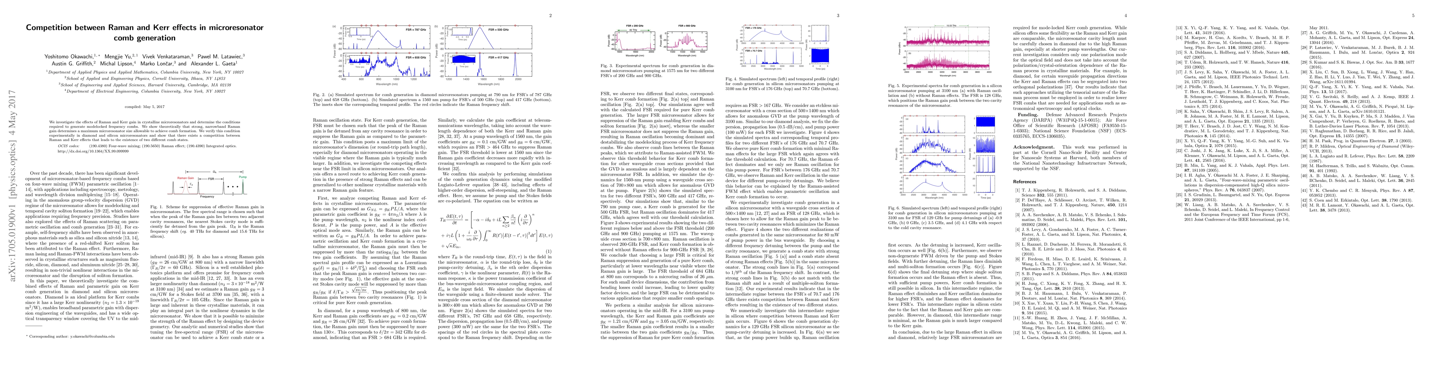 This paper investigates the interplay between Raman and Kerr effects in microresonators for frequency comb generation, demonstrating that strong Raman gain imposes a size limit on microresonators for comb formation, leading to two distinct comb states due to competition between these effects. Experimental verification in diamond and silicon microresonators supports the theoretical findings.