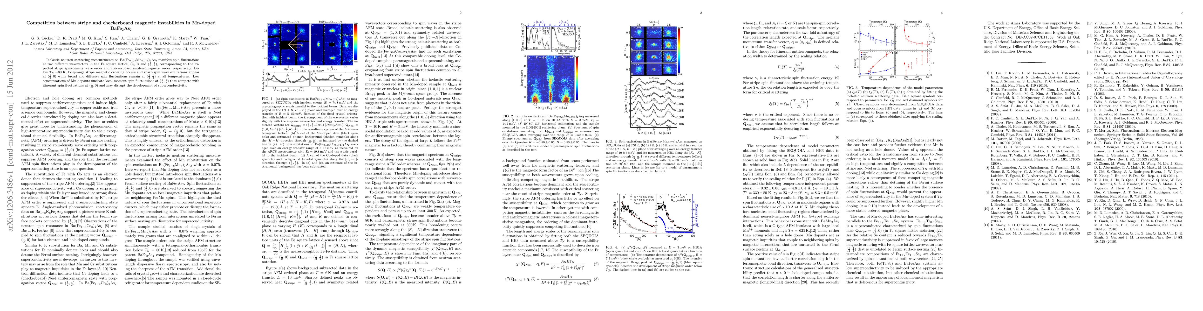 This study investigates the magnetic instabilities in Mn-doped BaFe2As2 using neutron scattering, revealing two distinct spin fluctuation wavevectors corresponding to stripe and checkerboard orders. Below 80 K, stripe ordering dominates, while checkerboard fluctuations persist, suggesting competition that may hinder superconductivity.