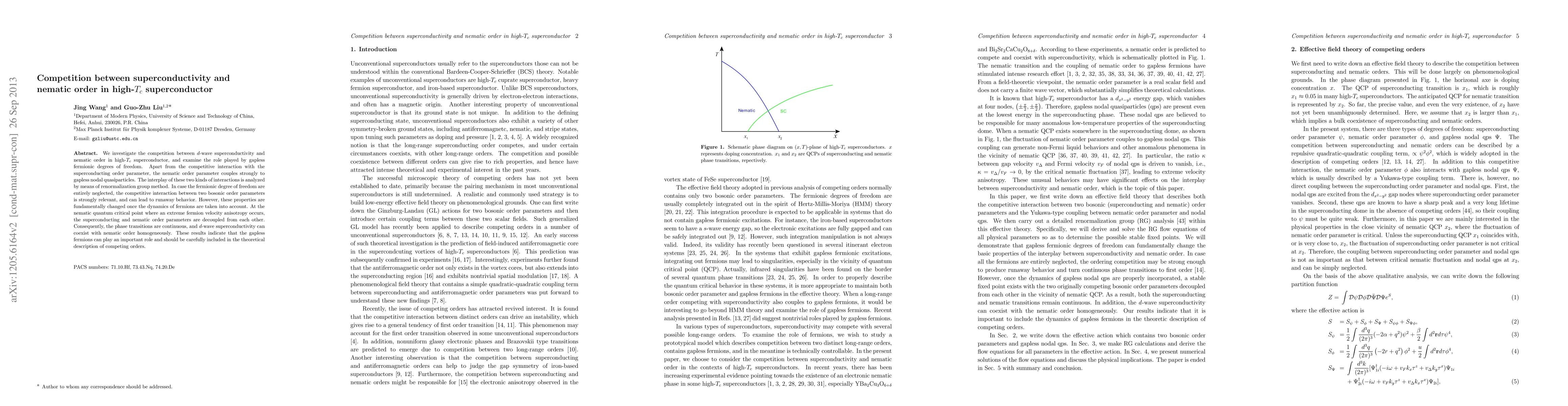 This paper explores the competition between d-wave superconductivity and nematic order in high-$T_c$ superconductors, revealing that gapless fermions significantly influence their interaction. When fermions are considered, the superconducting and nematic orders can coexist continuously, indicating the importance of fermionic dynamics in theoretical models.