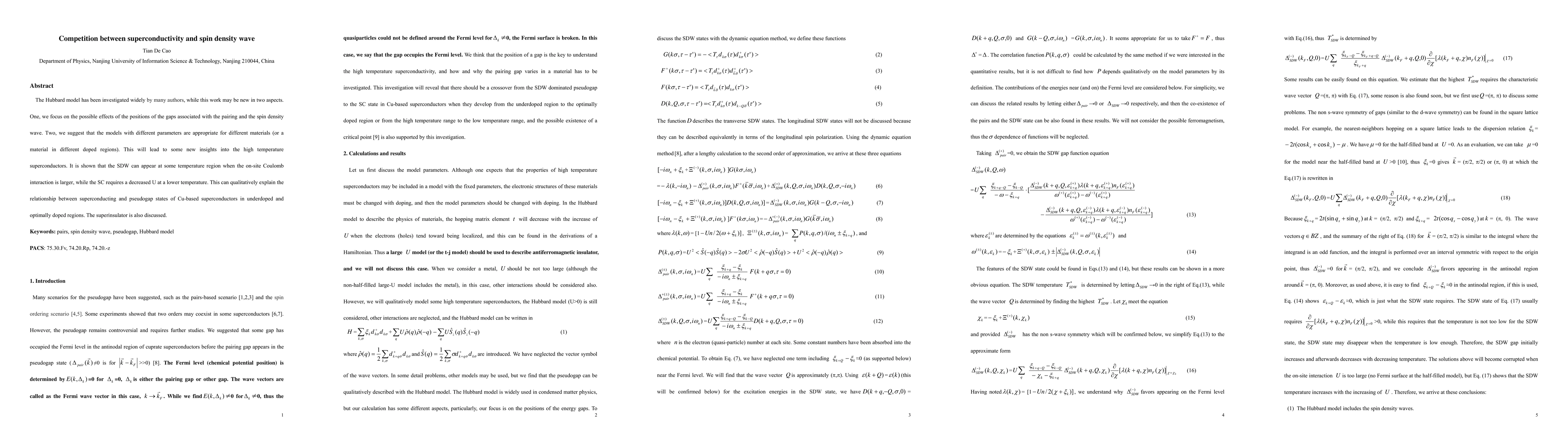 The Hubbard model has been investigated widely by many authors, while this work may be new in two aspects. One, we focus on the possible effects of the positions of the gaps associated with the pairing and the spin density wave. Two, we suggest that the models with different parameters are appropriate for different materials (or a material in different doped regions). This will lead to some new insights into the high temperature superconductors. It is shown that the SDW can appear at some temperature region when the on-site Coulomb interaction is larger, while the SC requires a decreased U at a lower temperature. This can qualitatively explain the relationship between superconducting and pseudogap states of Cu-based superconductors in underdoped and optimally doped regions. The superinsulator is also discussed.