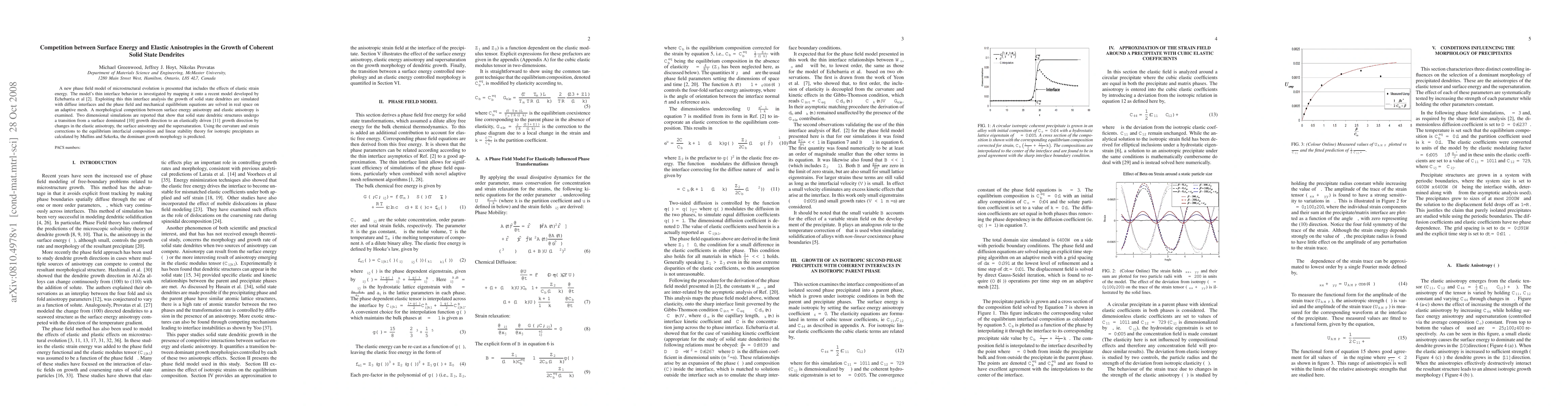 This paper presents a phase field model incorporating elastic strain energy to simulate the growth of coherent solid state dendrites, revealing a morphological competition between surface energy anisotropy and elastic anisotropy. Simulations show a transition in dendritic growth direction from surface-dominated to elastically driven, influenced by changes in anisotropy and supersaturation.
