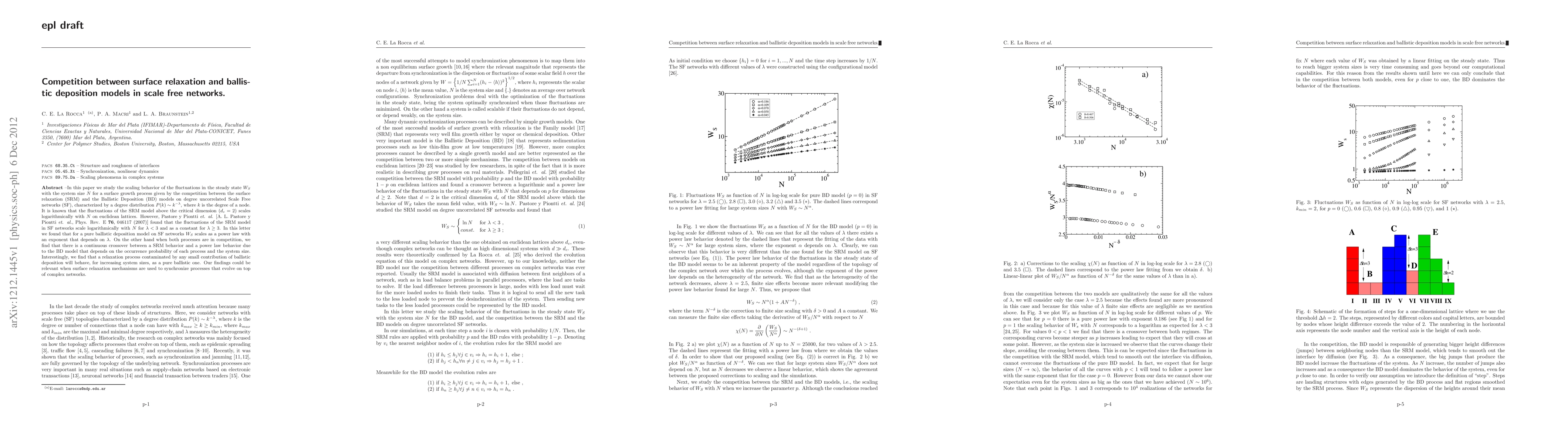 In this paper we study the scaling behavior of the fluctuations in the steady state $W_S$ with the system size $N$ for a surface growth process given by the competition between the surface relaxation (SRM) and the Ballistic Deposition (BD) models on degree uncorrelated Scale Free networks (SF), characterized by a degree distribution $P(k)\sim k^{-\lambda}$, where $k$ is the degree of a node. It is known that the fluctuations of the SRM model above the critical dimension ($d_c=2$) scales logarithmically with $N$ on euclidean lattices. However, Pastore y Piontti {\it et. al.} [A. L. Pastore y Piontti {\it et. al.}, Phys. Rev. E {\bf 76}, 046117 (2007)] found that the fluctuations of the SRM model in SF networks scale logarithmically with $N$ for $\lambda <3$ and as a constant for $\lambda \geq 3$. In this letter we found that for a pure ballistic deposition model on SF networks $W_S$ scales as a power law with an exponent that depends on $\lambda$. On the other hand when both processes are in competition, we find that there is a continuous crossover between a SRM behavior and a power law behavior due to the BD model that depends on the occurrence probability of each process and the system size. Interestingly, we find that a relaxation process contaminated by any small contribution of ballistic deposition will behave, for increasing system sizes, as a pure ballistic one. Our findings could be relevant when surface relaxation mechanisms are used to synchronize processes that evolve on top of complex networks.