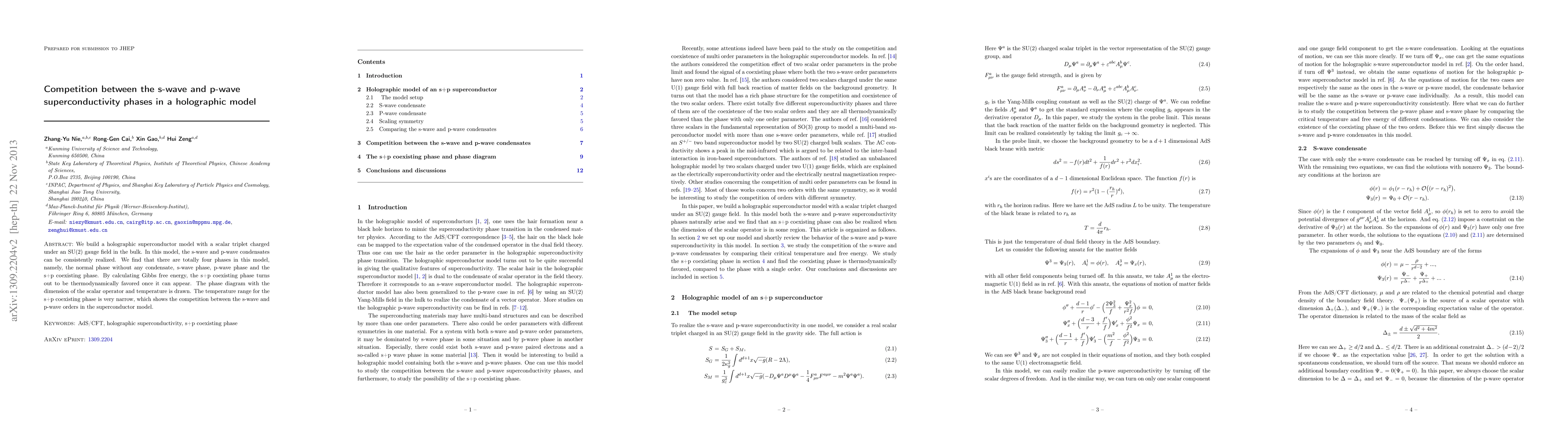 This paper constructs a holographic superconductor model featuring a scalar triplet under an SU(2) gauge field, identifying four superconducting phases: normal, s-wave, p-wave, and a coexisting s+p phase. The coexisting phase is thermodynamically favored but exists in a narrow temperature range, illustrating the competition between s-wave and p-wave superconductivity.