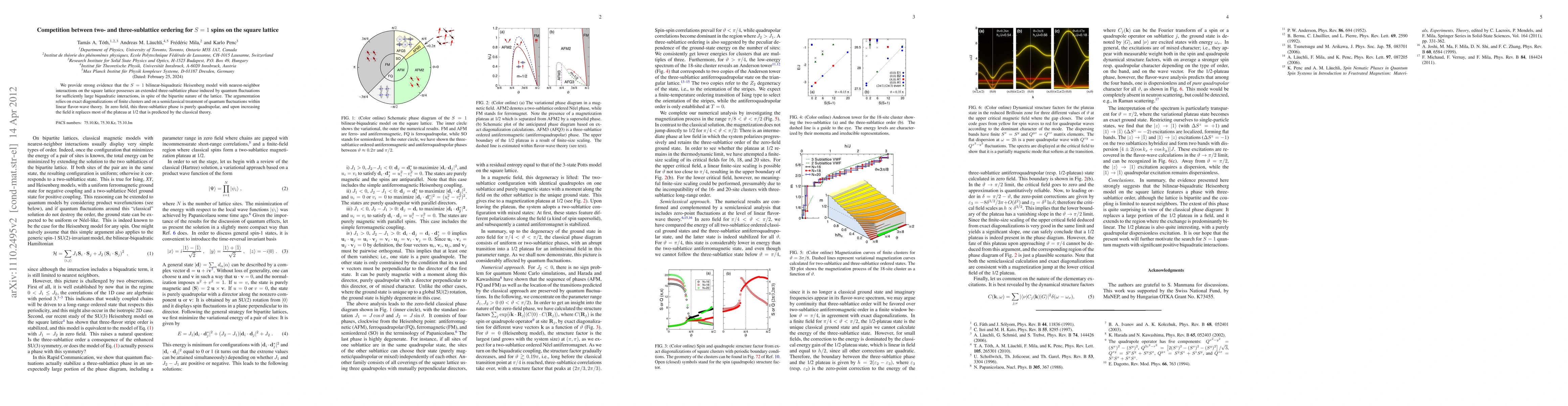 We provide strong evidence that the S=1 bilinear-biquadratic Heisenberg model with nearest-neighbor interactions on the square lattice possesses an extended three-sublattice phase induced by quantum fluctuations for sufficiently large biquadratic interactions, in spite of the bipartite nature of the lattice. The argumentation relies on exact diagonalizations of finite clusters and on a semiclassical treatment of quantum fluctuations within linear flavor-wave theory. In zero field, this three-sublattice phase is purely quadrupolar, and upon increasing the field it replaces most of the plateau at 1/2 that is predicted by the classical theory.