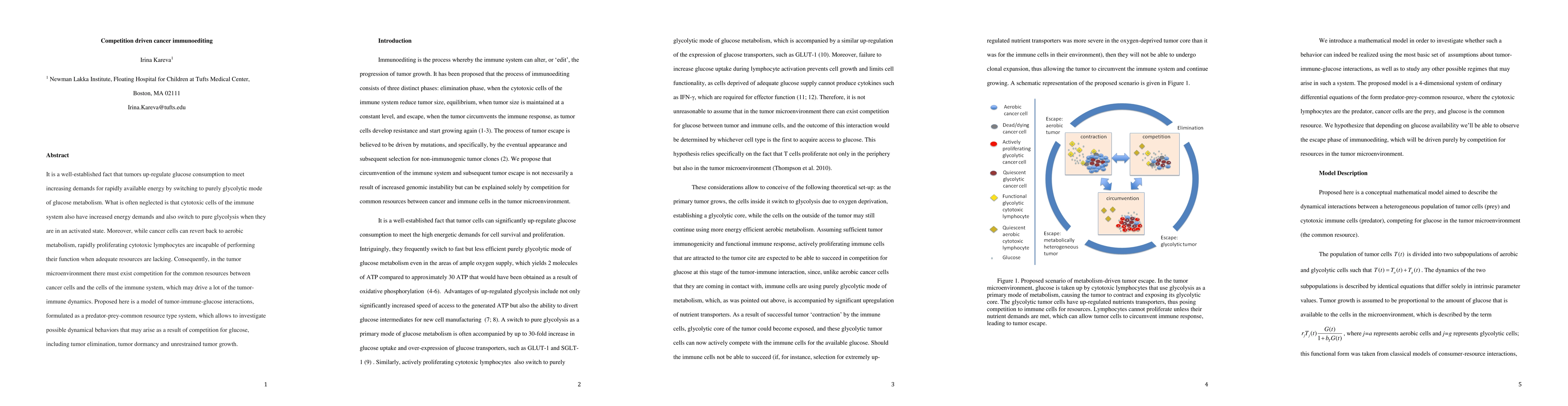 This research provides insights into the role of metabolic competition in tumor immune evasion, offering a theoretical framework to understand the limitations of immunotherapy and the importance of systemic immune stimulation in controlling tumor growth.