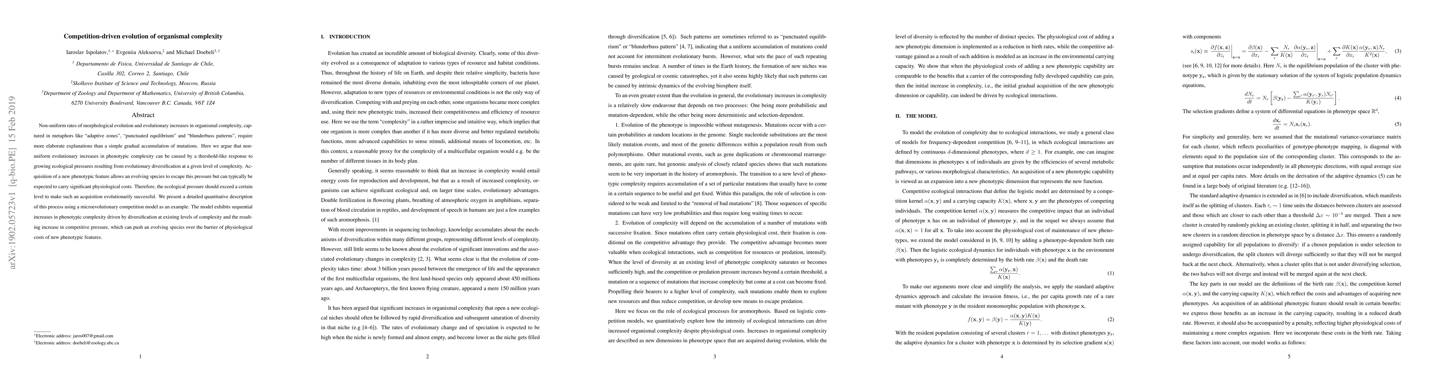 This paper argues that non-uniform increases in organismal complexity are driven by ecological pressures exceeding a threshold, leading to the evolution of new features to escape competition. The authors use a microevolutionary competition model to quantitatively demonstrate how diversification and rising competitive pressure can push species to evolve beyond physiological costs for new phenotypic traits.