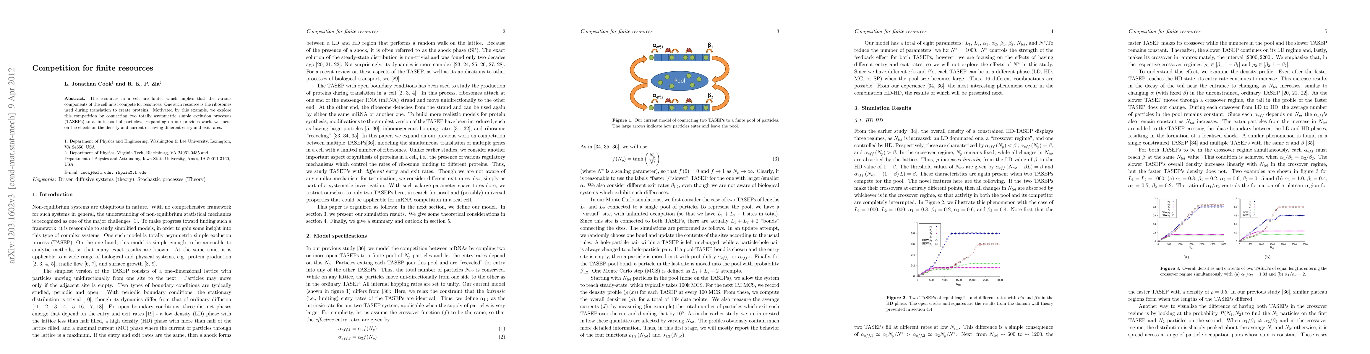 This paper investigates the competition for finite resources in a cellular context, specifically focusing on ribosomes during protein translation. It models the dynamics using two connected totally asymmetric simple exclusion processes with varying entry and exit rates, examining their impact on resource density and current flow.