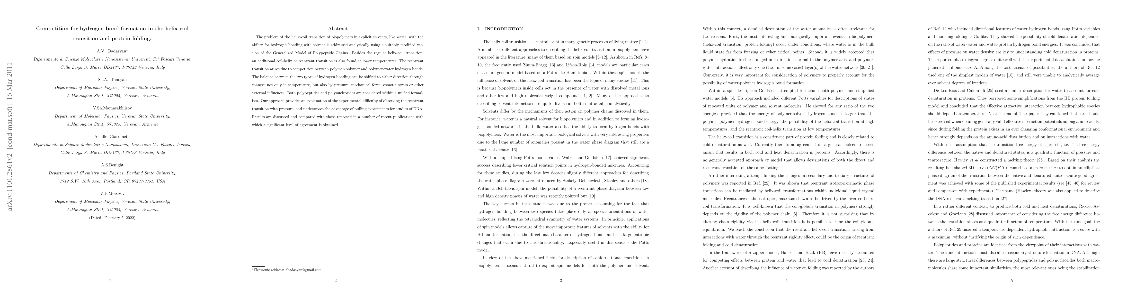 This paper analytically explores the helix-coil transition in biopolymers, emphasizing the competition between polymer-polymer and polymer-water hydrogen bonds, leading to a reentrant transition. The study uses a modified Generalized Model and finds that external factors like pressure and force can shift the balance between these hydrogen bonds, providing insights into experimental observations and the effectiveness of pulling experiments for DNA studies.