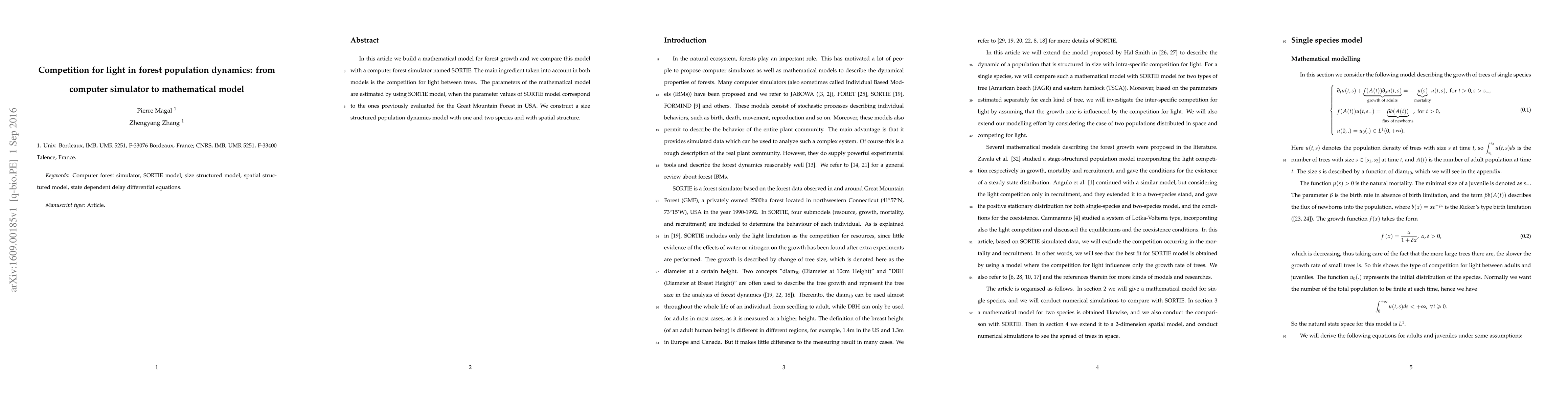 This paper develops a mathematical model for forest growth focusing on light competition among trees, and compares it to a computer simulator called SORTIE. The model parameters are calibrated using SORTIE data, specifically for the Great Mountain Forest, and it constructs a size-structured population dynamics model for one and two species with spatial considerations.