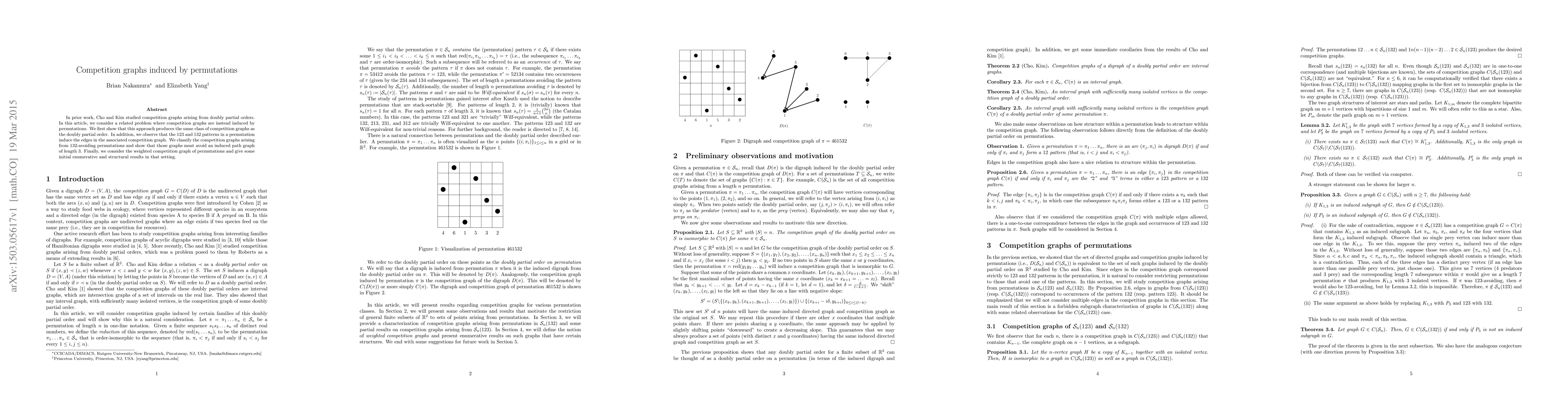 This paper studies competition graphs induced by permutations, demonstrating they produce the same class of graphs as those from doubly partial orders. It classifies competition graphs from $132$-avoiding permutations, showing they avoid induced path graphs of length 3, and explores initial results for weighted competition graphs.
