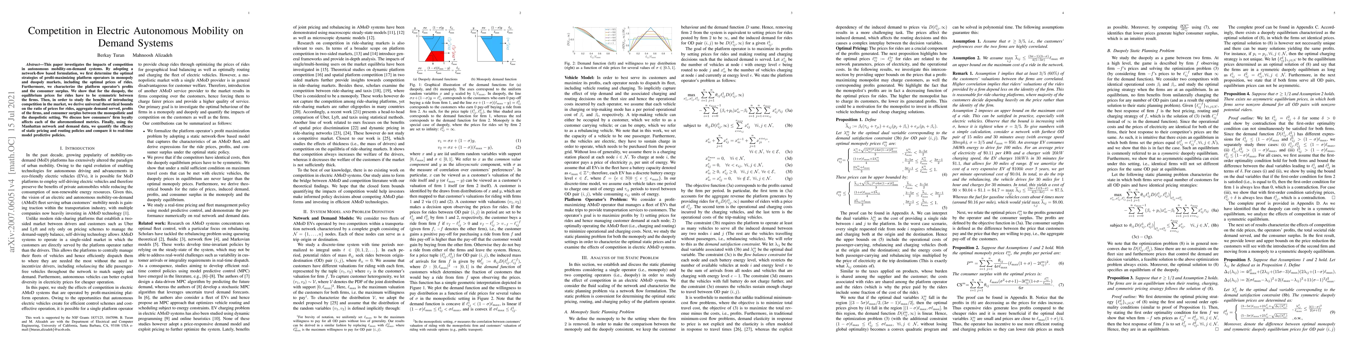 This paper investigates the impacts of competition in autonomous mobility-on-demand systems. By adopting a network-flow based formulation, we first determine the optimal strategies of profit-maximizing platform operators in monopoly and duopoly markets, including the optimal prices of rides. Furthermore, we characterize the platform operator's profits and the consumer surplus. We show that for the duopoly, the equilibrium prices for rides have to be symmetric between the firms. Then, in order to study the benefits of introducing competition in the market, we derive universal theoretical bounds on the ratio of prices for rides, aggregate demand served, profits of the firms, and consumer surplus between the monopolistic and the duopolistic setting. We discuss how consumers' firm loyalty affects each of the aforementioned metrics. Finally, using the Manhattan network and demand data, we quantify the efficacy of static pricing and routing policies and compare it to real-time model predictive policies.