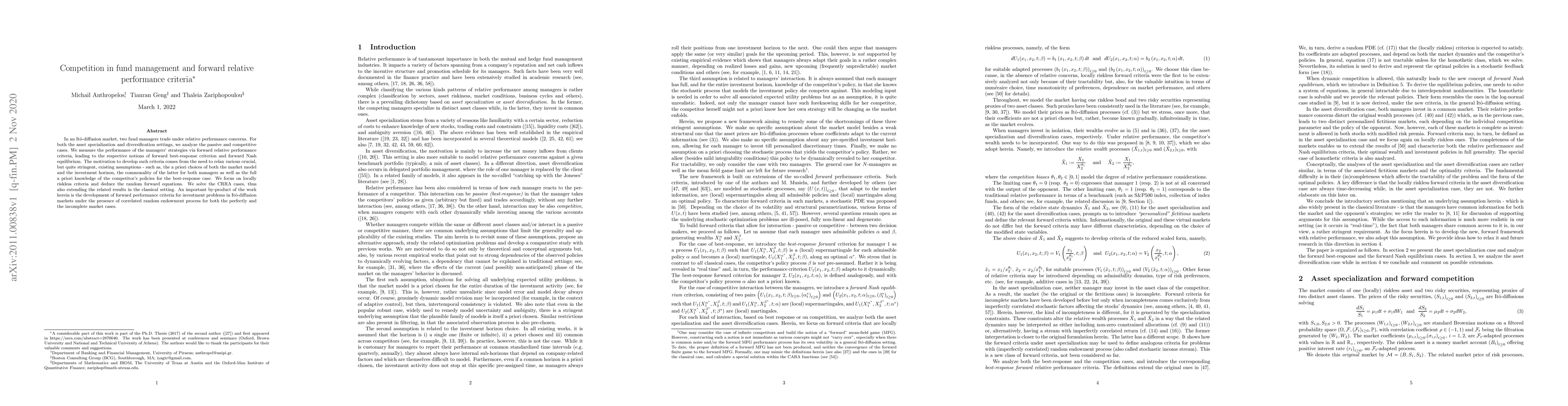This research paper analyzes competition in fund management by developing forward relative performance criteria for Ito-diffusion markets, extending classical results to CRRA cases with correlated random endowments.
