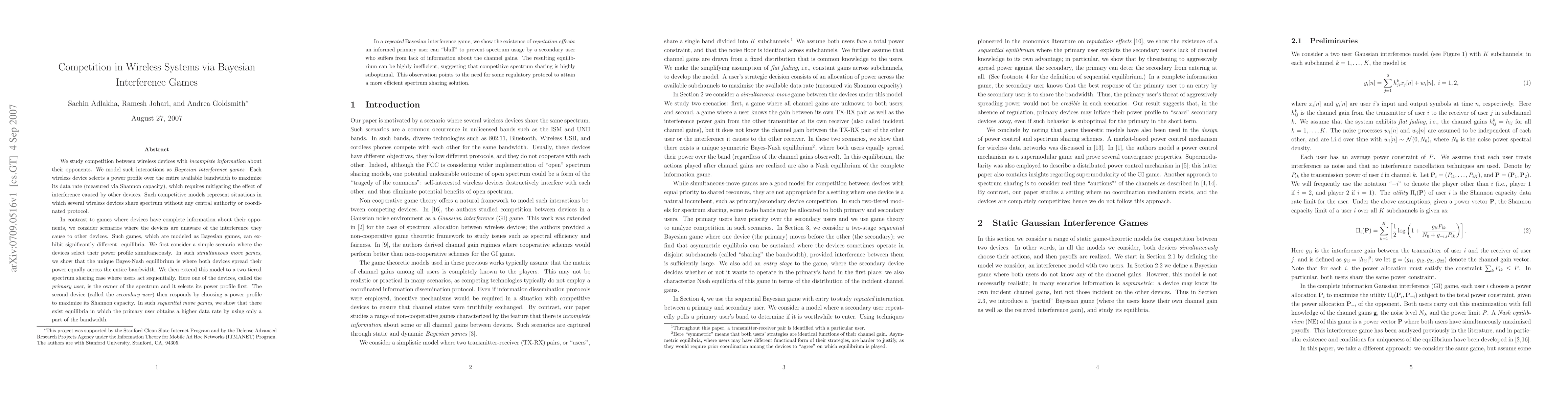 Researchers studied competition between wireless devices with incomplete information about their opponents using Bayesian interference games, finding that sequential move games can lead to inefficient equilibria where one user obtains a higher data rate by using only part of the bandwidth.