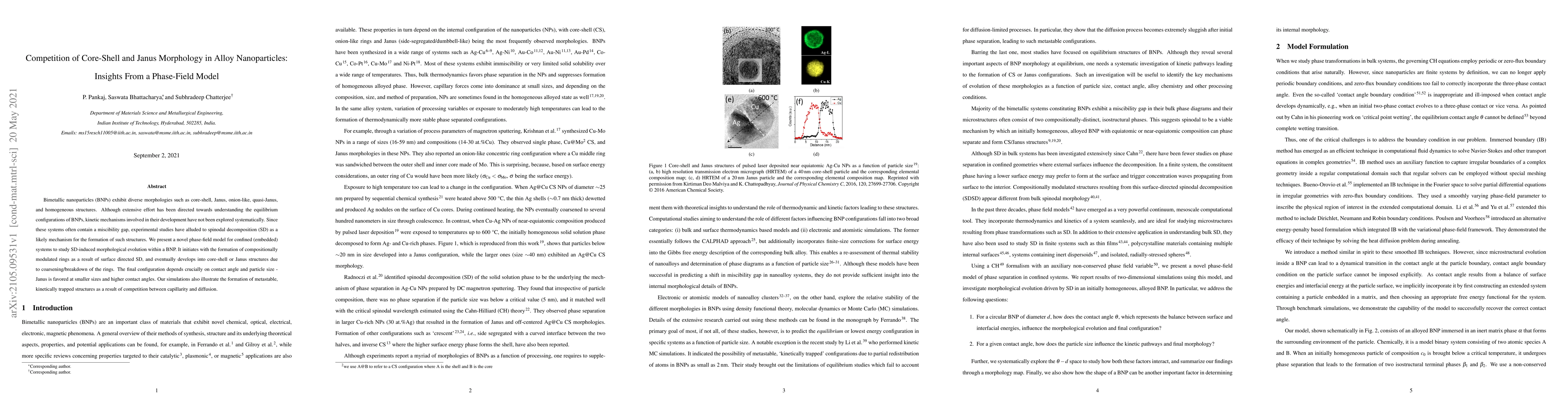 This paper introduces a phase-field model to investigate the kinetic mechanisms behind the formation of core-shell and Janus morphologies in bimetallic nanoparticles, revealing that the final structure depends on particle size and contact angle, with Janus configurations favored at smaller sizes and higher contact angles. The model also highlights the emergence of metastable structures due to the interplay between capillarity and diffusion.