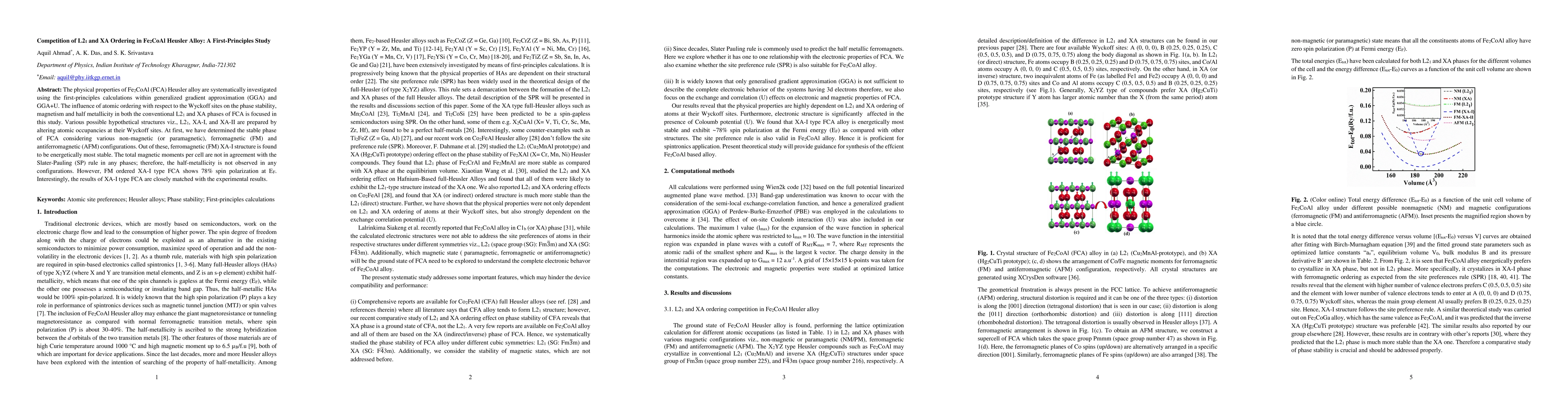 This study investigates the physical properties of Fe2CoAl (FCA) Heusler alloy using first-principles calculations, focusing on the stability, magnetism, and half-metallicity of L21 and XA orderings. The ferromagnetic XA-I structure is found to be the most stable, showing 78% spin polarization at the Fermi level, though it does not exhibit half-metallicity.