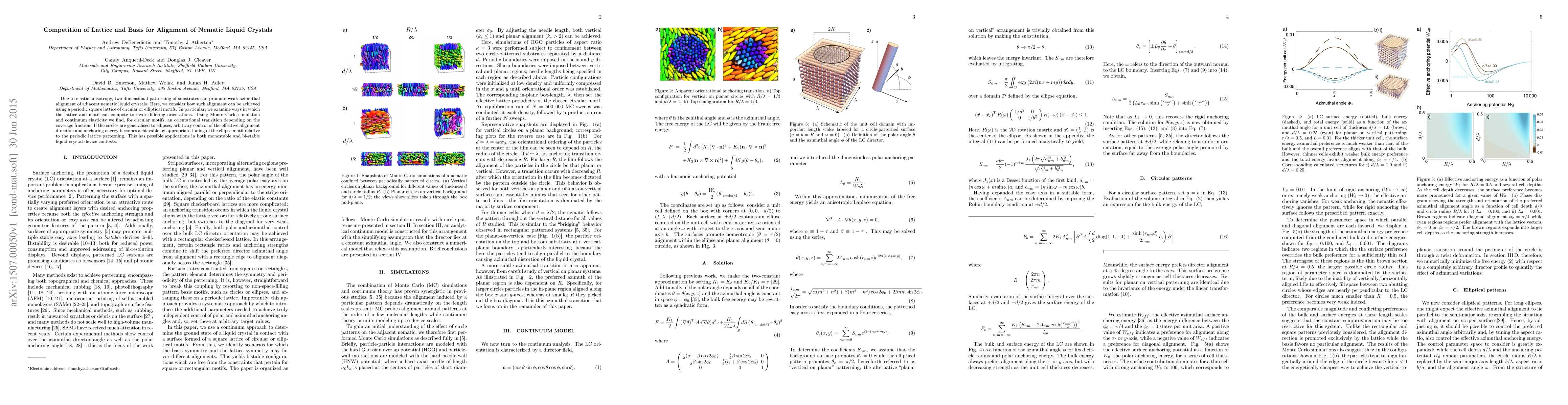 Due to elastic anisotropy, two-dimensional patterning of substrates can promote weak azimuthal alignment of adjacent nematic liquid crystals. Here, we consider how such alignment can be achieved using a periodic square lattice of circular or elliptical motifs. In particular, we examine ways in which the lattice and motif can compete to favor differing orientations. Using Monte Carlo simulation and continuum elasticity we find, for circular motifs, an orientational transition depending on the coverage fraction. If the circles are generalised to ellipses, arbitrary control of the effective alignment direction and anchoring energy becomes achievable by appropriate tuning of the ellipse motif relative to the periodic lattice patterning. This has possible applications in both monostable and bi-stable liquid crystal device contexts.