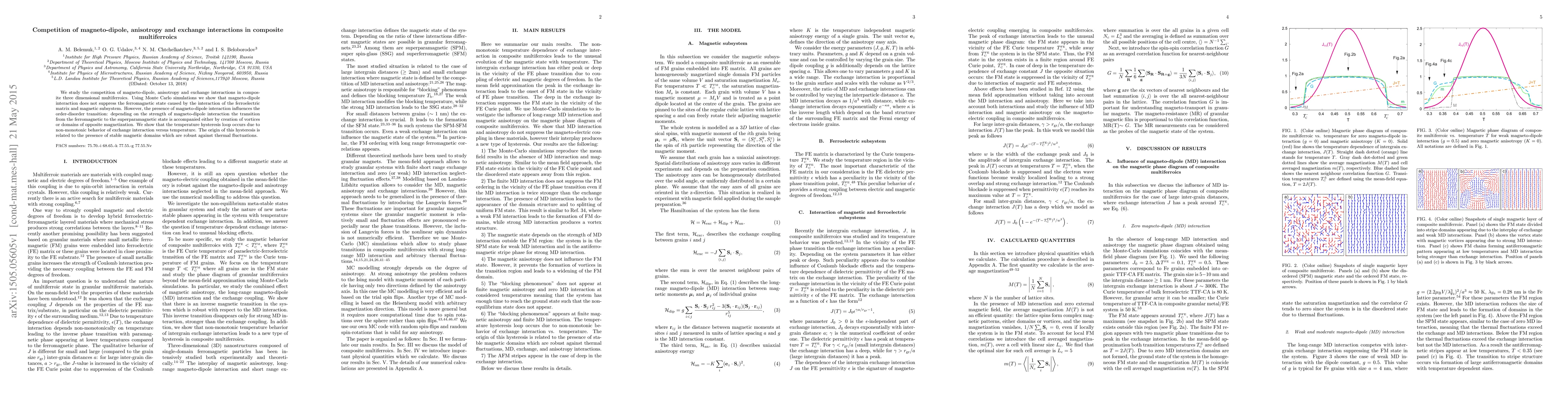 This paper investigates the interplay of magneto-dipole, anisotropy, and exchange interactions in composite three-dimensional multiferroics using Monte Carlo simulations. It finds that magneto-dipole interaction does not inhibit the ferromagnetic state but influences the transition from ferromagnetic to superparamagnetic states, leading to either vortex or domain formation. Temperature hysteresis is attributed to stable magnetic domains that resist thermal fluctuations.