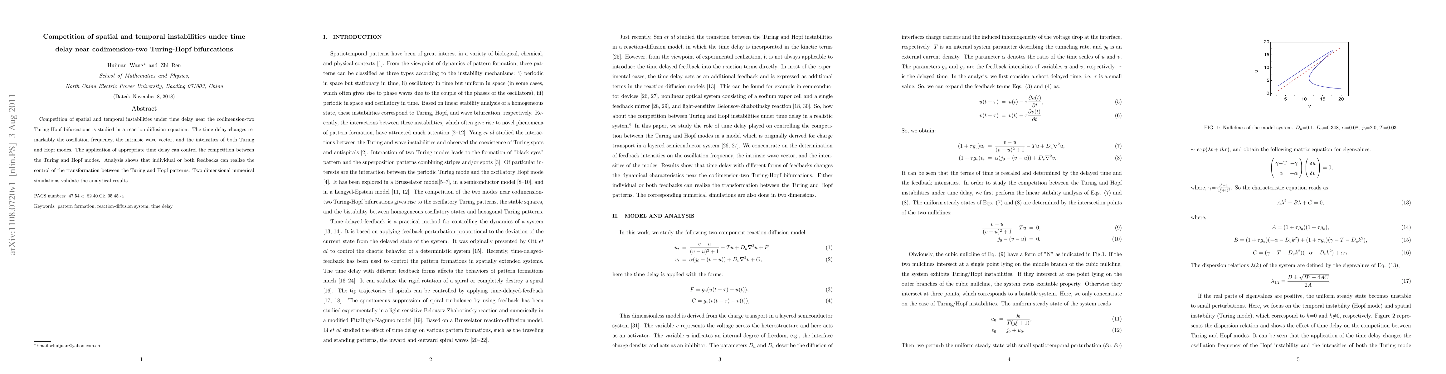 This paper investigates how time delay influences spatial and temporal instabilities in reaction-diffusion systems near codimension-two Turing-Hopf bifurcations, demonstrating that it can control the competition between Turing and Hopf modes. Analytical and numerical results show that appropriate time delay can manage the transformation between these patterns.