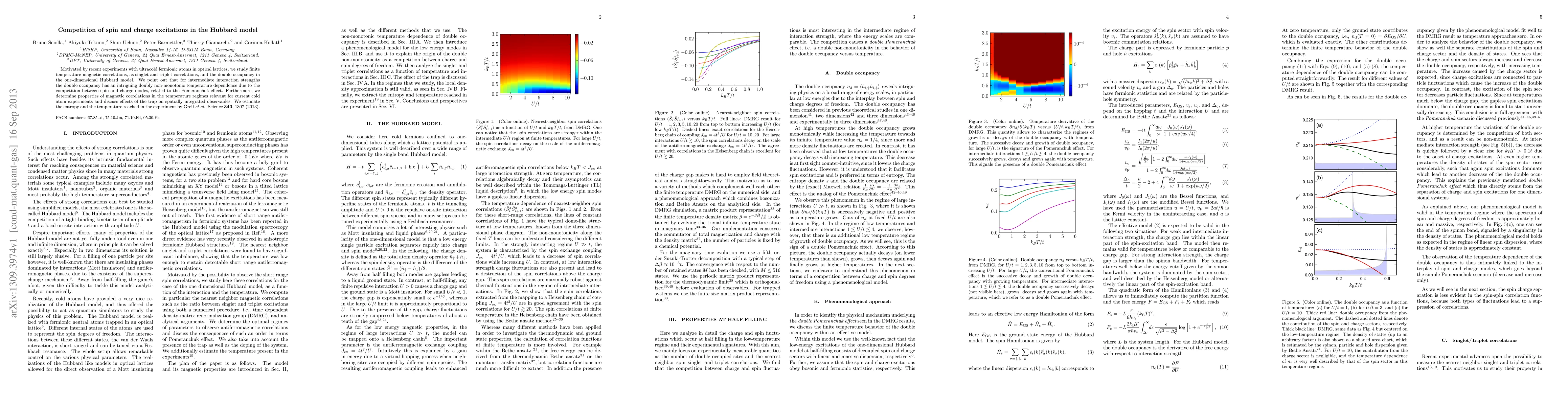 Motivated by recent experiments with ultracold fermionic atoms in optical lattices, we study finite temperature magnetic correlations, as singlet and triplet correlations, and the double occupancy in the one-dimensional Hubbard model. We point out that for intermediate interaction strengths the double occupancy has an intriguing doubly non-monotonic temperature dependence due to the competition between spin and charge modes, related to the Pomeranchuk effect. Furthermore, we determine properties of magnetic correlations in the temperature regimes relevant for current cold atom experiments and discuss effects of the trap on spatially integrated observables. We estimate the entropy and the temperature reached in the experiment by Greif et al., Science 340, 1307 (2013).