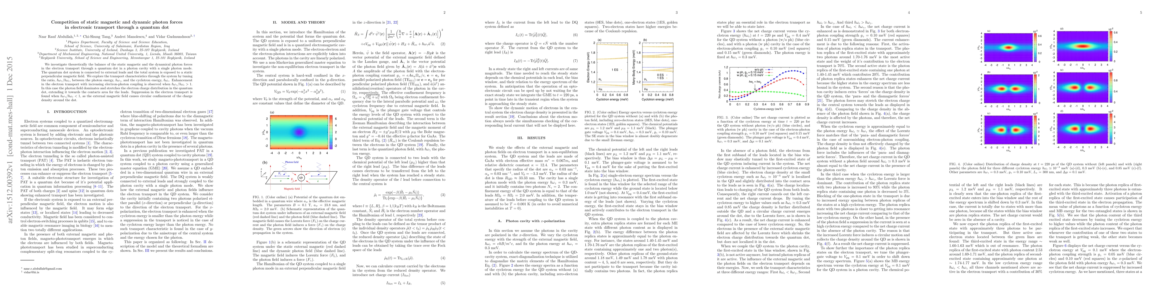 This paper theoretically examines the interplay between static magnetic and dynamic photon forces in electron transport through a quantum dot in a photon cavity, finding enhanced transport when photon energy exceeds cyclotron energy, and suppression when it is less.