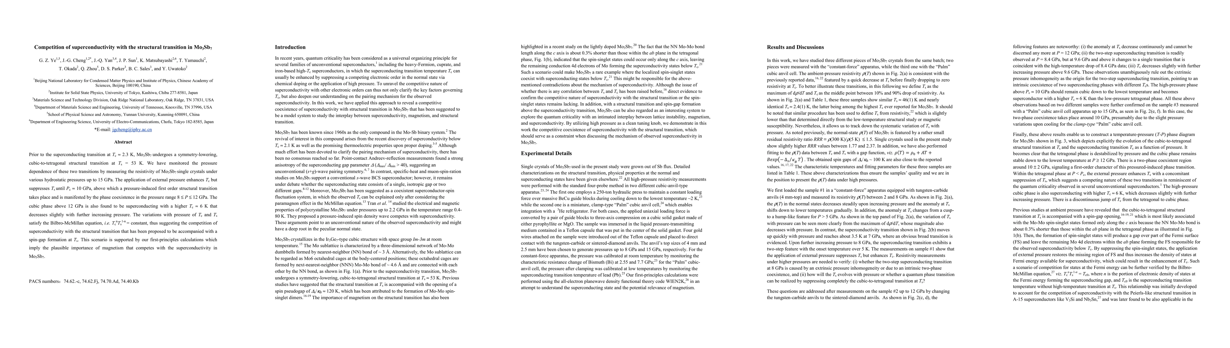 Prior to the superconducting transition at Tc = 2.3 K, Mo3Sb7 undergoes a symmetry-lowering, cubic-to-tetragonal structural transition at Ts = 53 K. We have monitored the pressure dependence of these two transitions by measuring the resistivity of Mo3Sb7 single crystals under various hydrostatic pressures up to 15 GPa. The application of external pressure enhances Tc but suppresses Ts until Pc ~ 10 GPa, above which a pressure-induced first order structural transition takes place and is manifested by the phase coexistence in the pressure range 8 < P < 12 GPa. The cubic phase above 12 GPa is also found to be superconducting with a higher Tc =6 K that decreases slightly with further increasing pressure. The variations with pressure of Tc and Ts satisfy the Bilbro-McMillan equation, i.e. Tc^nTs^(1-n) = constant, thus suggesting the competition of superconductivity with the structural transition that has been proposed to be accompanied with a spin-gap formation at Ts. This scenario is supported by our first-principles calculations which imply the plausible importance of magnetism that competes with the superconductivity in Mo3Sb7.