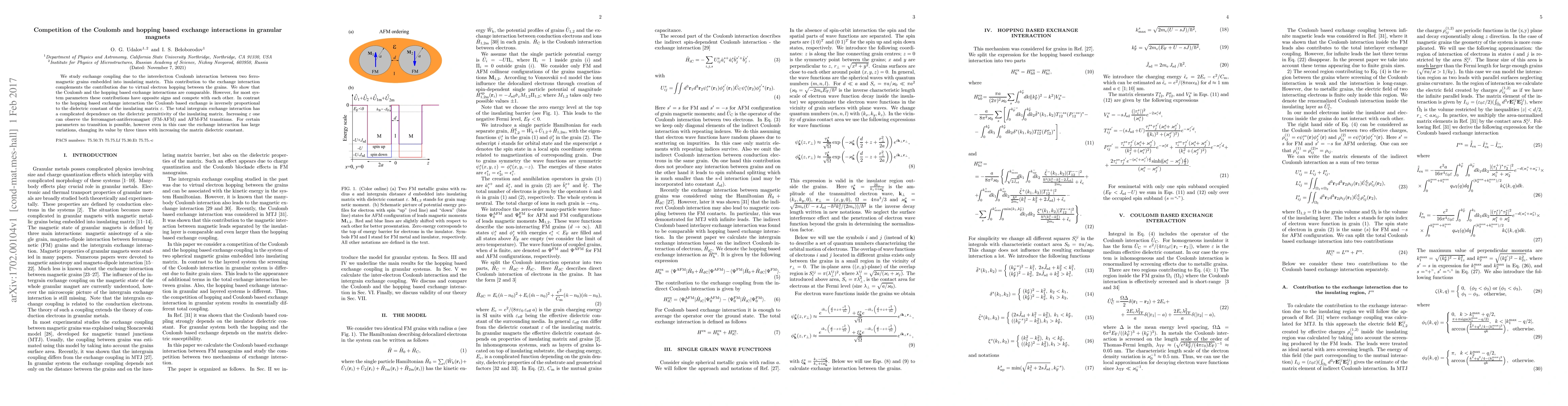 This paper investigates the competition between Coulomb-based and hopping-based exchange interactions in granular magnets. It finds that both interactions are comparable but often oppose each other, leading to complex dependencies on the insulating matrix's dielectric constant, which can induce ferromagnet-antiferromagnet transitions.