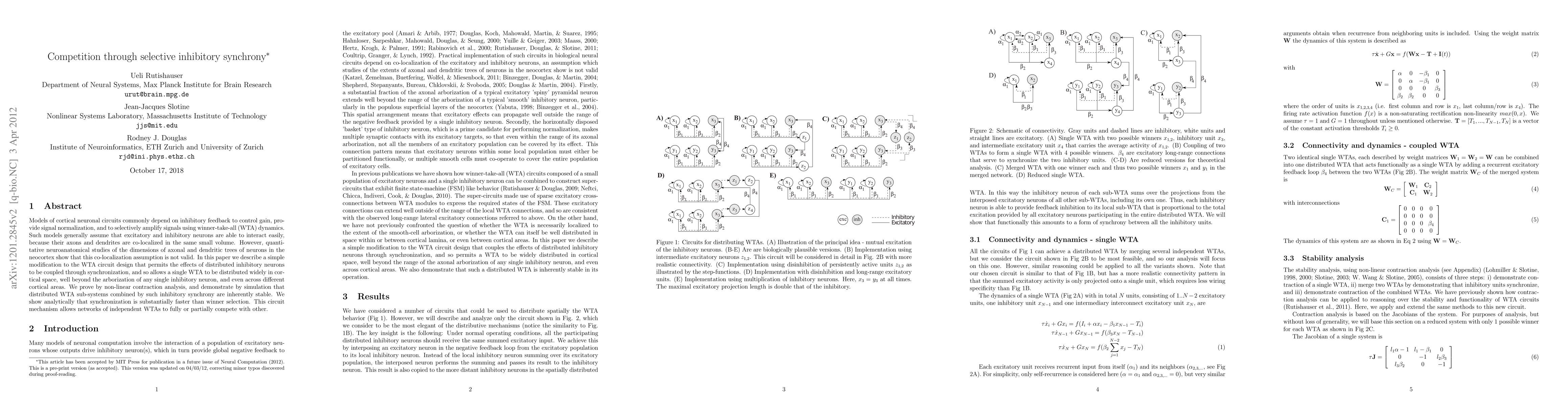 Models of cortical neuronal circuits commonly depend on inhibitory feedback to control gain, provide signal normalization, and to selectively amplify signals using winner-take-all (WTA) dynamics. Such models generally assume that excitatory and inhibitory neurons are able to interact easily, because their axons and dendrites are co-localized in the same small volume. However, quantitative neuroanatomical studies of the dimensions of axonal and dendritic trees of neurons in the neocortex show that this co-localization assumption is not valid. In this paper we describe a simple modification to the WTA circuit design that permits the effects of distributed inhibitory neurons to be coupled through synchronization, and so allows a single WTA to be distributed widely in cortical space, well beyond the arborization of any single inhibitory neuron, and even across different cortical areas. We prove by non-linear contraction analysis, and demonstrate by simulation that distributed WTA sub-systems combined by such inhibitory synchrony are inherently stable. We show analytically that synchronization is substantially faster than winner selection. This circuit mechanism allows networks of independent WTAs to fully or partially compete with each other.