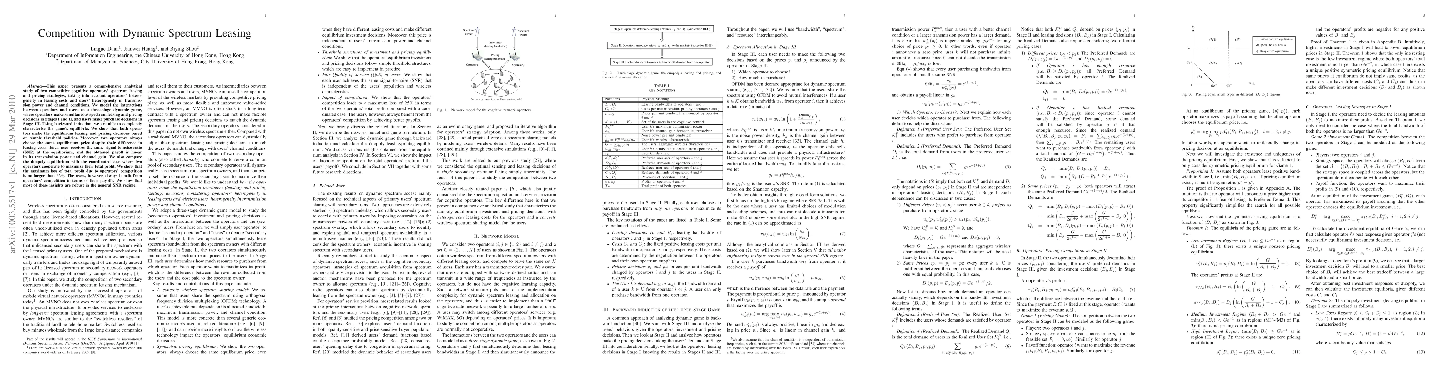 This paper presents a comprehensive analytical study of two competitive cognitive operators' spectrum leasing and pricing strategies, taking into account operators' heterogeneity in leasing costs and users' heterogeneity in transmission power and channel conditions. We model the interactions between operators and users as a three-stage dynamic game, where operators make simultaneous spectrum leasing and pricing decisions in Stages I and II, and users make purchase decisions in Stage III. Using backward induction, we are able to completely characterize the game's equilibria. We show that both operators make the equilibrium leasing and pricing decisions based on simple threshold policies. Moreover, two operators always choose the same equilibrium price despite their difference in leasing costs. Each user receives the same signal-to-noise-ratio (SNR) at the equilibrium, and the obtained payoff is linear in its transmission power and channel gain. We also compare the duopoly equilibrium with the coordinated case where two operators cooperate to maximize their total profit. We show that the maximum loss of total profit due to operators' competition is no larger than 25%. The users, however, always benefit from operators' competition in terms of their payoffs. We show that most of these insights are robust in the general SNR regime.