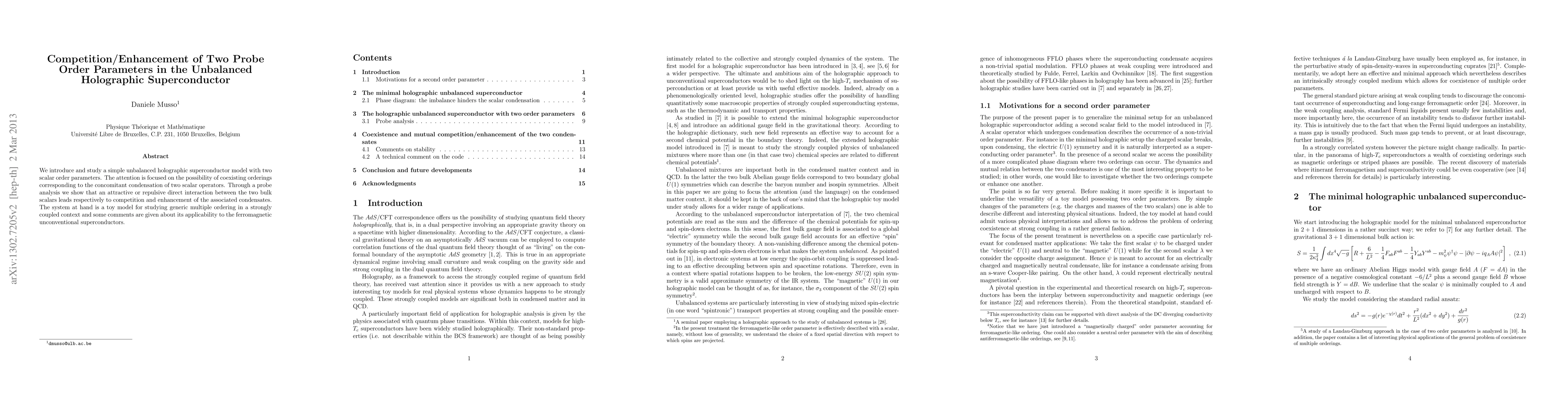 We introduce and study a simple unbalanced holographic superconductor model with two scalar order parameters. The attention is focused on the possibility of coexisting orderings corresponding to the concomitant condensation of two scalar operators. Through a probe analysis we show that an attractive or repulsive direct interaction between the two bulk scalars leads respectively to competition and enhancement of the associated condensates. The system at hand is a toy model for studying generic multiple ordering in a strongly coupled context and some comments are given about its applicability to the ferromagnetic unconventional superconductors.