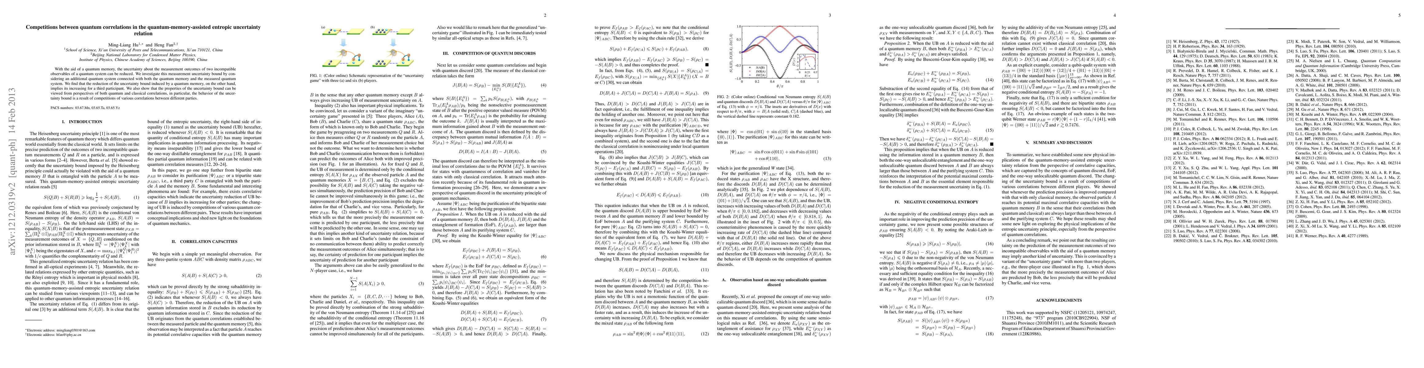 A quantum memory can reduce uncertainty about measurement outcomes for one party, but increases it for a third party in a three-party system. The reduction of uncertainty is due to competing correlations between different parties.