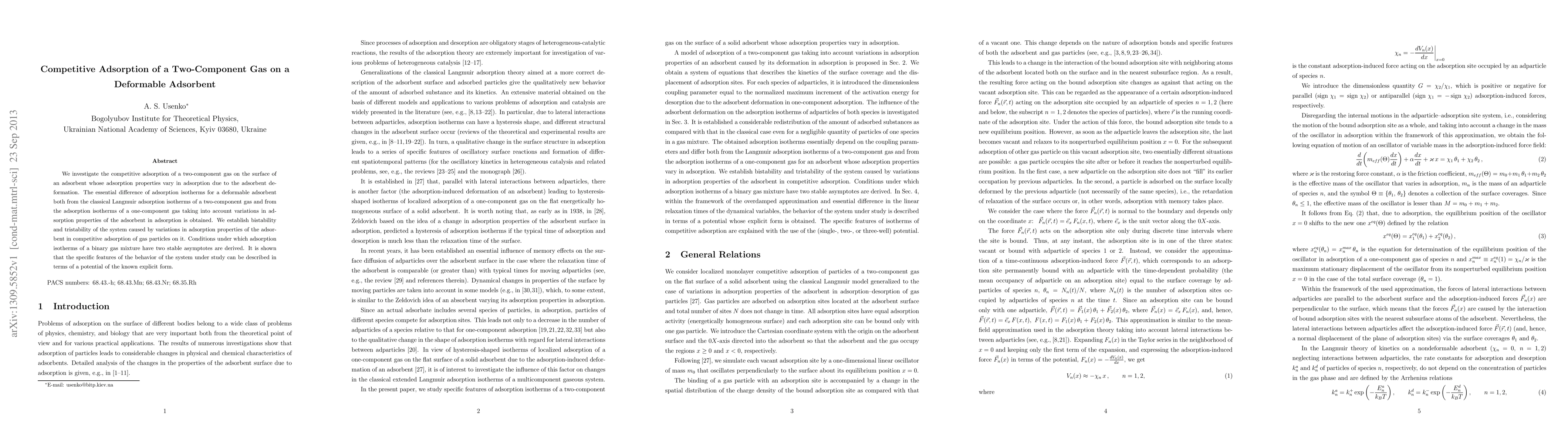 This paper explores the competitive adsorption dynamics of a two-component gas on a deformable adsorbent, revealing unique adsorption isotherms and establishing bistability and tristability due to the adsorbent's changing properties. The study derives conditions for two stable asymptotes in binary gas mixtures and describes the system's behavior using a specific potential function.