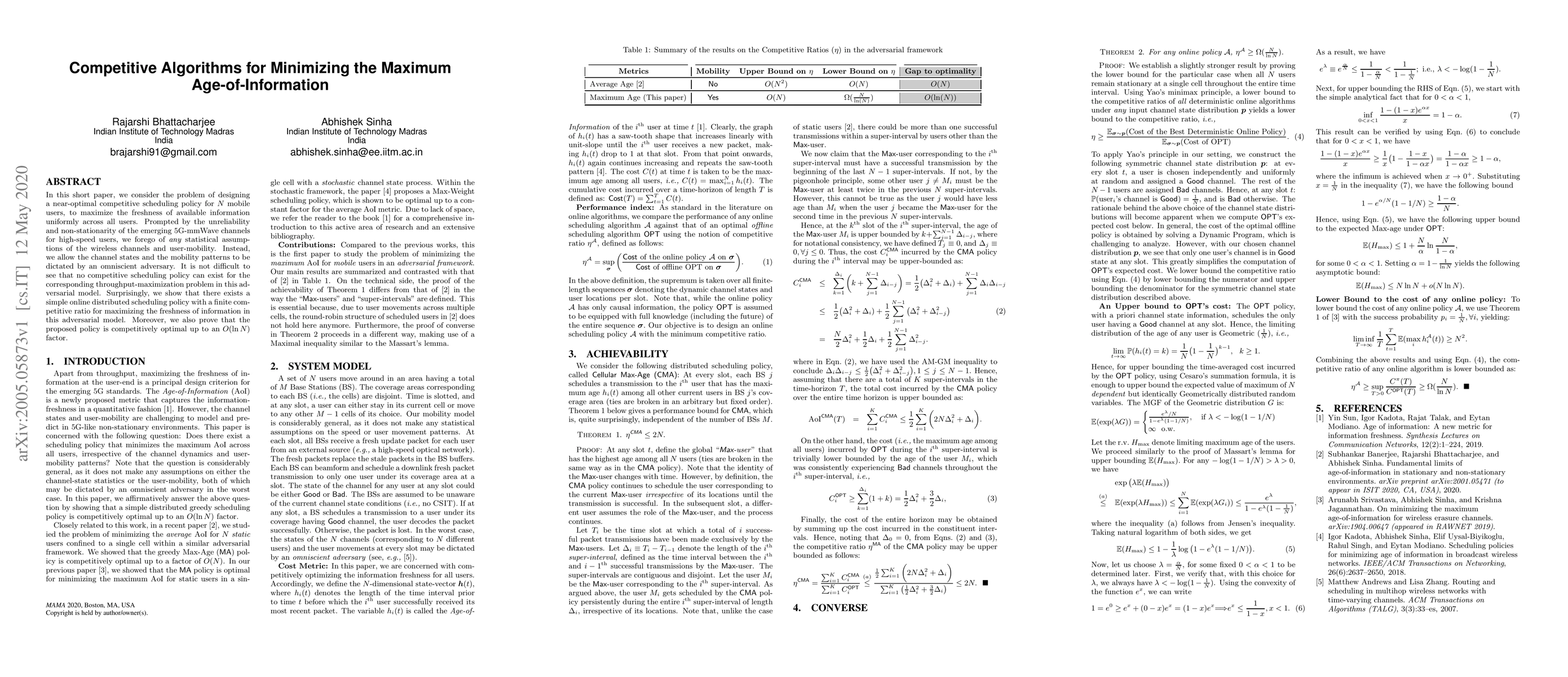 In this short paper, we consider the problem of designing a near-optimal competitive scheduling policy for $N$ mobile users, to maximize the freshness of available information uniformly across all users. Prompted by the unreliability and non-stationarity of the emerging 5G-mmWave channels for high-speed users, we forego of any statistical assumptions of the wireless channels and user-mobility. Instead, we allow the channel states and the mobility patterns to be dictated by an omniscient adversary. It is not difficult to see that no competitive scheduling policy can exist for the corresponding throughput-maximization problem in this adversarial model. Surprisingly, we show that there exists a simple online distributed scheduling policy with a finite competitive ratio for maximizing the freshness of information in this adversarial model. Moreover, we also prove that the proposed policy is competitively optimal up to an $O(\ln N)$ factor.