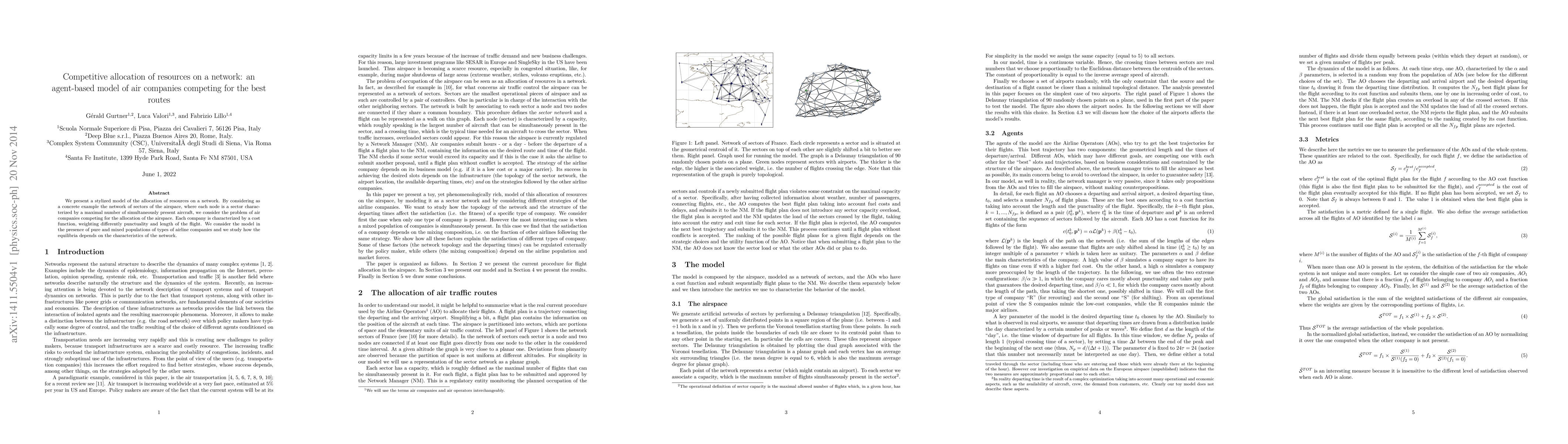 We present a stylized model of the allocation of resources on a network. By considering as a concrete example the network of sectors of the airspace, where each node is a sector characterized by a maximal number of simultaneously present aircraft, we consider the problem of air companies competing for the allocation of the airspace. Each company is characterized by a cost function, weighting differently punctuality and length of the flight. We consider the model in the presence of pure and mixed populations of types of airline companies and we study how the equilibria depends on the characteristics of the network.