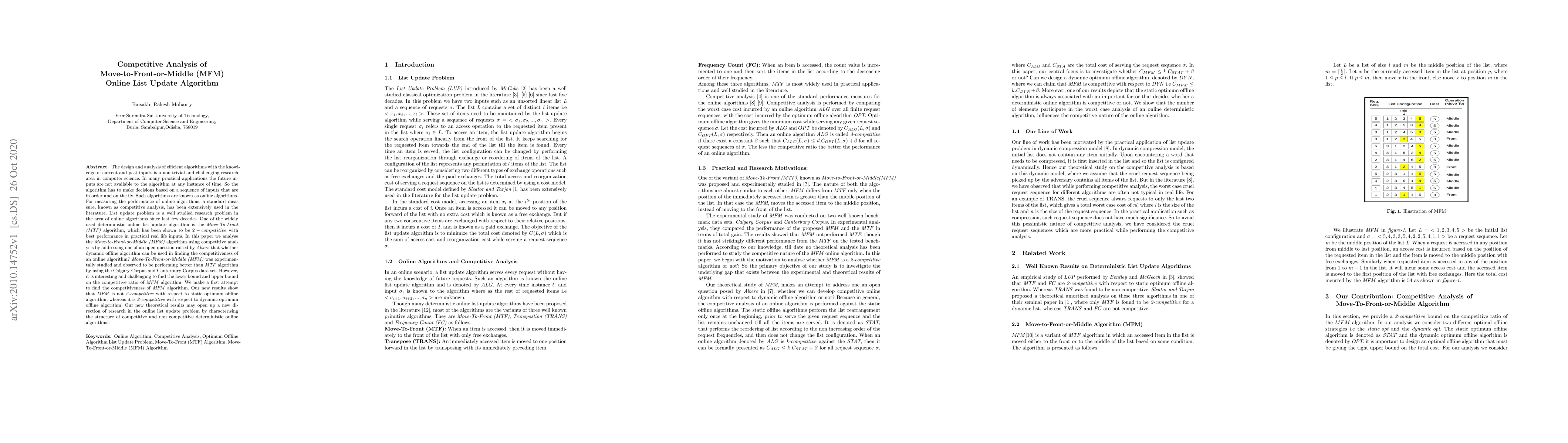 This paper analyzes the Move-to-Front-or-Middle (MFM) online list update algorithm using competitive analysis, finding it 2-competitive with dynamic offline algorithms but not with static ones. This challenges previous assumptions and opens new research directions in online algorithms.