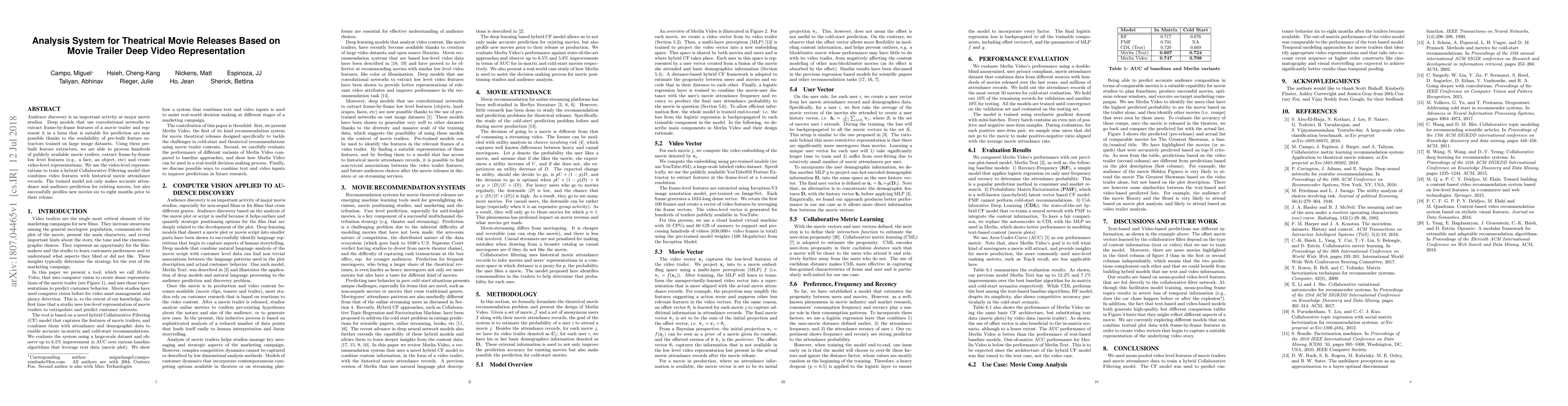 This research develops a competitive analysis system for theatrical movie releases using deep video representation of movie trailers. It employs convolutional networks to extract features and train a hybrid Collaborative Filtering model that predicts movie attendance and audience profiles, even for new releases months in advance.