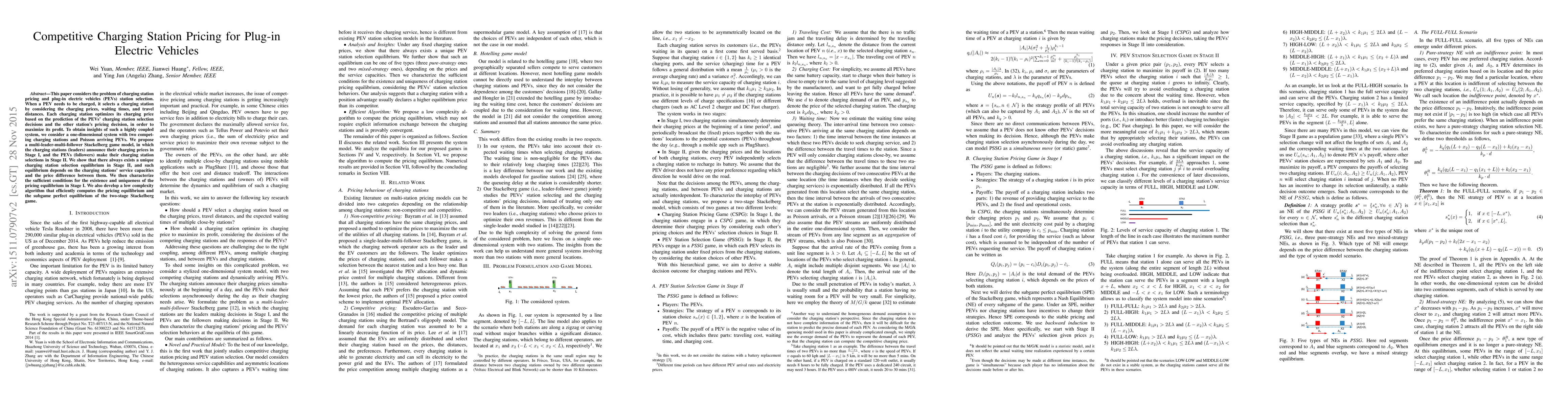 This paper considers the problem of charging station pricing and plug-in electric vehicles (PEVs) station selection. When a PEV needs to be charged, it selects a charging station by considering the charging prices, waiting times, and travel distances. Each charging station optimizes its charging price based on the prediction of the PEVs' charging station selection decisions and the other station's pricing decision, in order to maximize its profit. To obtain insights of such a highly coupled system, we consider a one-dimensional system with two competing charging stations and Poisson arriving PEVs. We propose a multi-leader-multi-follower Stackelberg game model, in which the charging stations (leaders) announce their charging prices in Stage I, and the PEVs (followers) make their charging station selections in Stage II. We show that there always exists a unique charging station selection equilibrium in Stage II, and such equilibrium depends on the charging stations' service capacities and the price difference between them. We then characterize the sufficient conditions for the existence and uniqueness of the pricing equilibrium in Stage I. We also develop a low complexity algorithm that efficiently computes the pricing equilibrium and the subgame perfect equilibrium of the two-stage Stackelberg game.