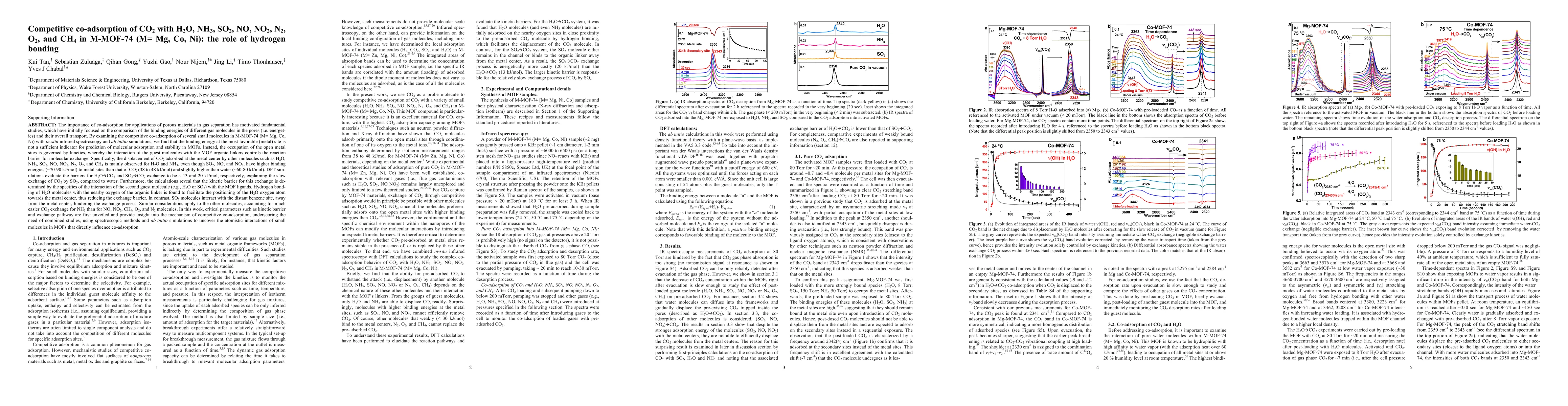 This study investigates the competitive co-adsorption of various gases in M-MOF-74 (M= Mg, Co, Ni) using in-situ infrared spectroscopy and ab initio simulations. It finds that while higher binding energies do not predict adsorption stability, kinetic barriers for molecular exchange are primarily governed by the interaction between guest molecules and MOF organic linkers, with H2O and NH3 displacing CO2 more readily than other gases despite having lower binding energies.