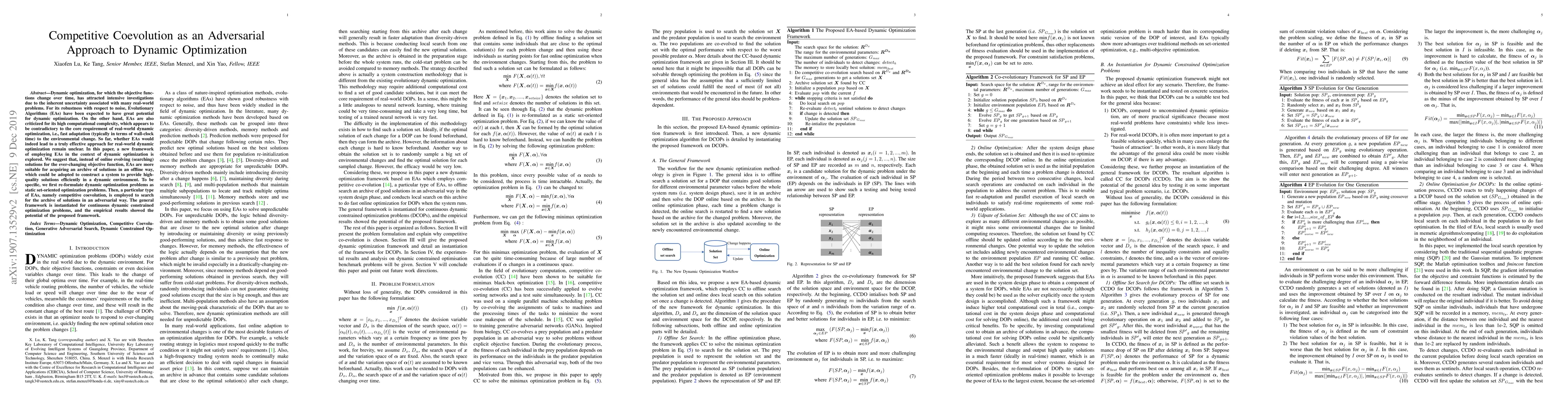 This paper proposes a competitive coevolution framework for dynamic optimization, suggesting that Evolutionary Algorithms (EAs) should generate an archive of solutions offline rather than continuously adapting to changing objective functions. The approach re-formulates dynamic optimization as static set-oriented problems and uses competitive coevolution to efficiently provide high-quality solutions in dynamic environments.