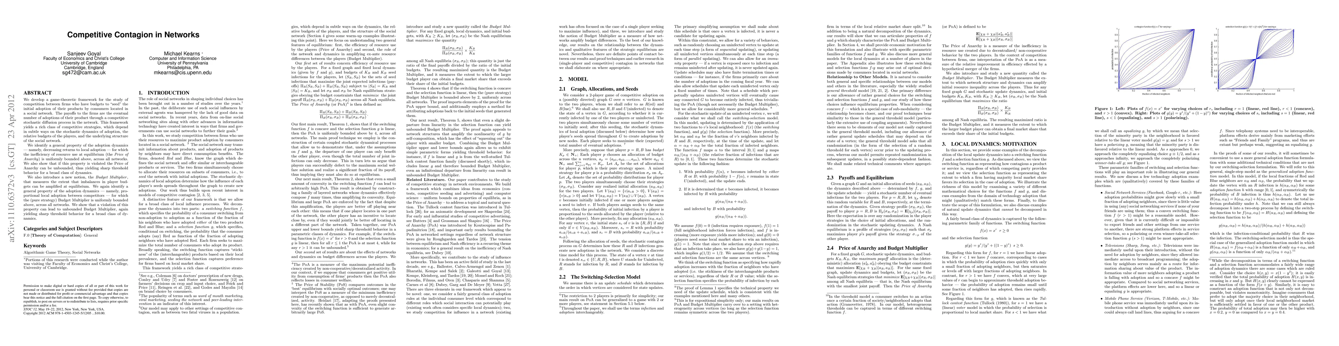 We develop a game-theoretic framework for the study of competition between firms who have budgets to "seed" the initial adoption of their products by consumers located in a social network. The payoffs to the firms are the eventual number of adoptions of their product through a competitive stochastic diffusion process in the network. This framework yields a rich class of competitive strategies, which depend in subtle ways on the stochastic dynamics of adoption, the relative budgets of the players, and the underlying structure of the social network. We identify a general property of the adoption dynamics --- namely, decreasing returns to local adoption --- for which the inefficiency of resource use at equilibrium (the Price of Anarchy) is uniformly bounded above, across all networks. We also show that if this property is violated the Price of Anarchy can be unbounded, thus yielding sharp threshold behavior for a broad class of dynamics. We also introduce a new notion, the Budget Multiplier, that measures the extent that imbalances in player budgets can be amplified at equilibrium. We again identify a general property of the adoption dynamics --- namely, proportional local adoption between competitors --- for which the (pure strategy) Budget Multiplier is uniformly bounded above, across all networks. We show that a violation of this property can lead to unbounded Budget Multiplier, again yielding sharp threshold behavior for a broad class of dynamics.