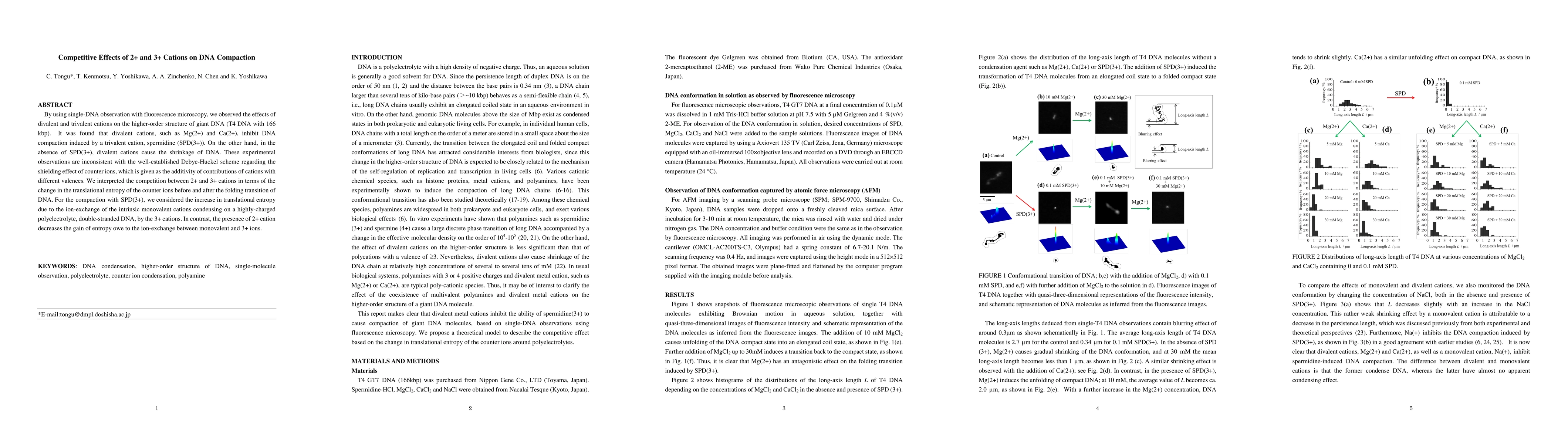 This study investigates the competitive effects of divalent (Mg²⁺, Ca²⁺) and trivalent (spermidine, SPD³⁺) cations on DNA compaction using single-DNA fluorescence microscopy. It reveals that divalent cations inhibit SPD³⁺-induced compaction but cause DNA shrinkage in their absence, challenging the Debye-Hückel theory. The findings suggest that competition between cations is governed by changes in translational entropy during DNA folding.