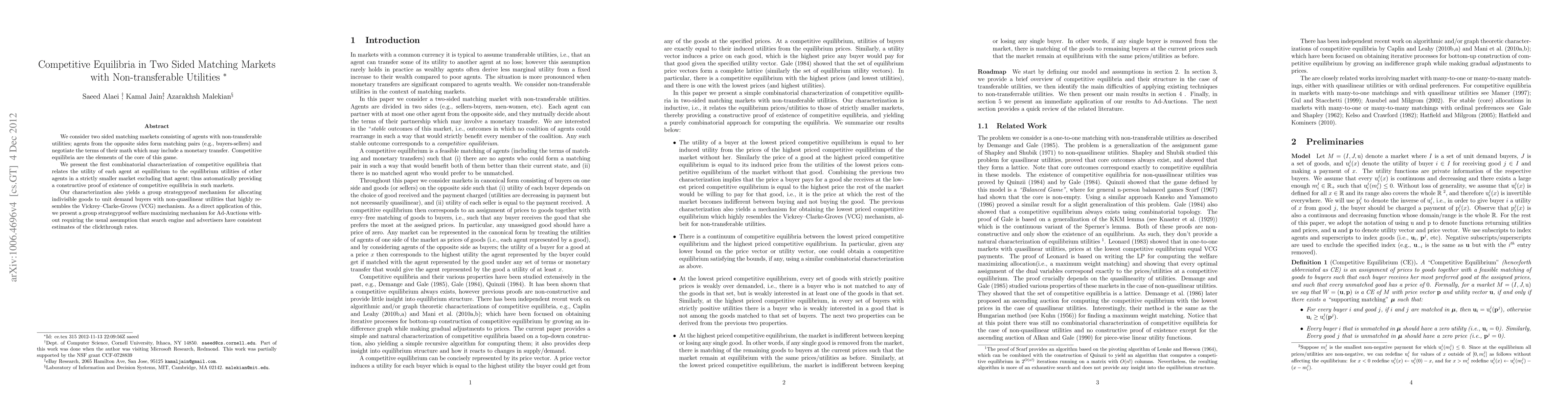 We consider two sided matching markets consisting of agents with non-transferable utilities; agents from the opposite sides form matching pairs (e.g., buyers-sellers) and negotiate the terms of their math which may include a monetary transfer. Competitive equilibria are the elements of the core of this game. We present the first combinatorial characterization of competitive equilibria that relates the utility of each agent at equilibrium to the equilibrium utilities of other agents in a strictly smaller market excluding that agent; thus automatically providing a constructive proof of existence of competitive equilibria in such markets. Our characterization also yields a group strategyproof mechanism for allocating indivisible goods to unit demand buyers with non-quasilinear utilities that highly resembles the Vickrey Clarke Groves (VCG) mechanism. As a direct application of this, we present a group strategyproof welfare maximizing mechanism for Ad-Auctions without requiring the usual assumption that search engine and advertisers have consistent estimates of the clickthrough rates.