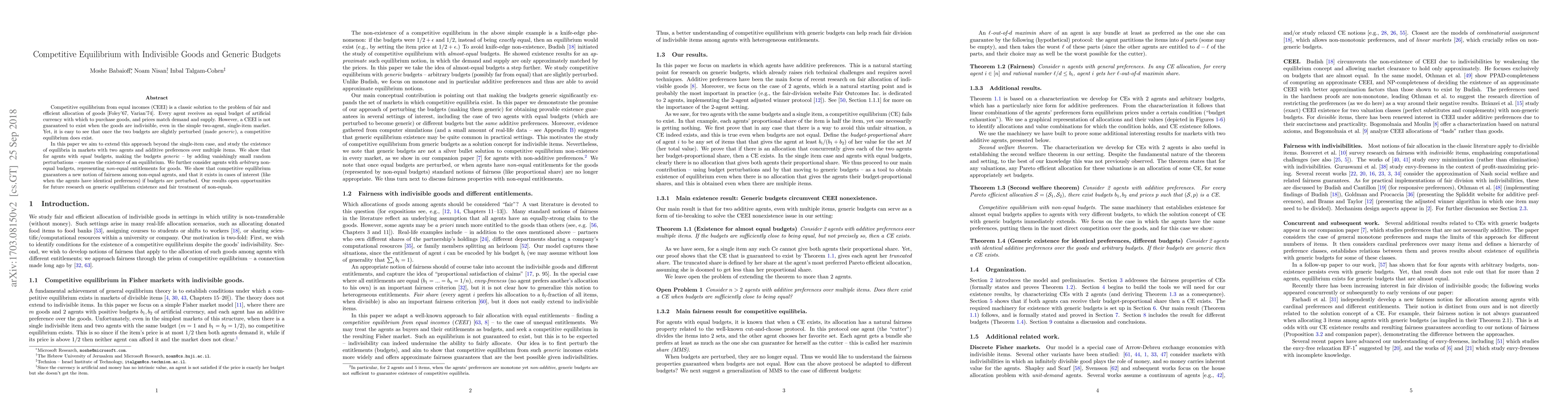 This paper explores the existence of competitive equilibrium in markets with indivisible goods and unequal budgets, demonstrating that slight perturbations (generic budgets) ensure equilibrium. It extends the concept beyond single-item markets and highlights the emergence of fairness in allocations among non-equal agents.