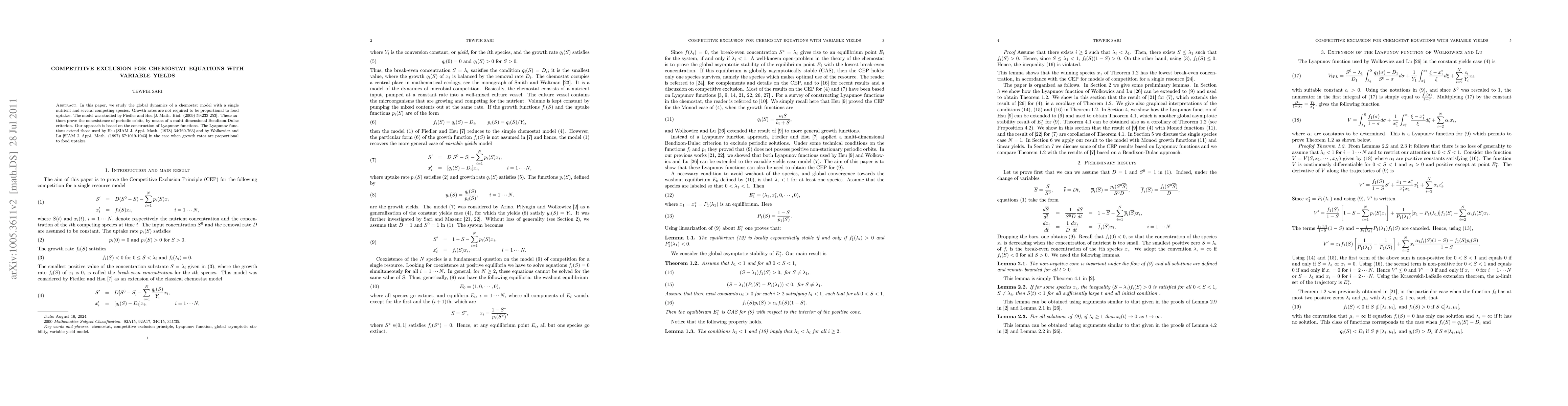 This paper investigates the global dynamics of chemostat models with variable yield rates for competing species, extending previous work that assumed proportional growth rates. The authors construct Lyapunov functions to demonstrate the nonexistence of periodic orbits, building on earlier methods used for proportional growth scenarios.