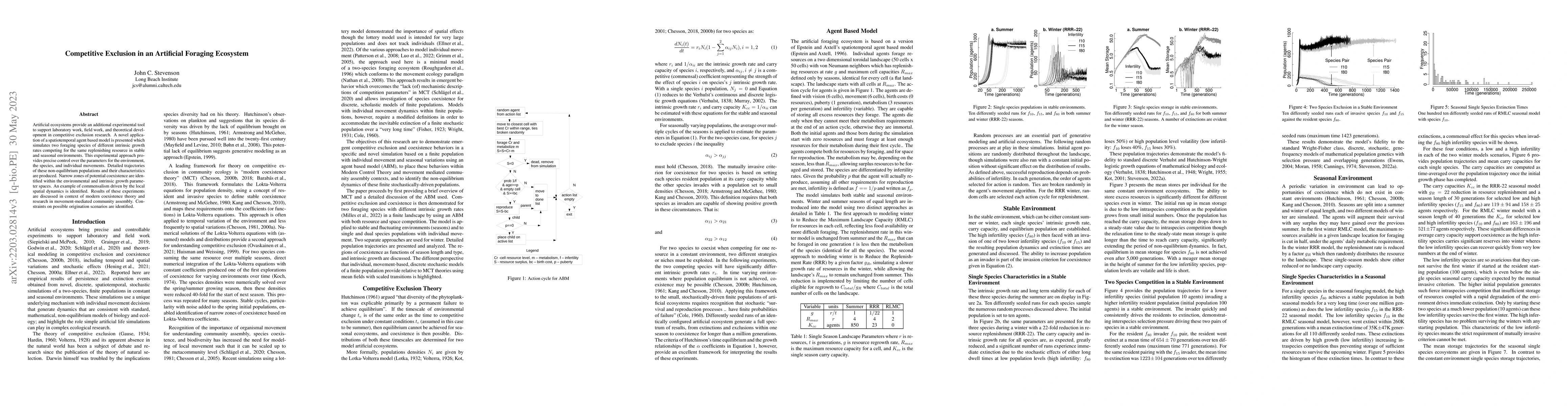 Artificial ecosystems provide an additional experimental tool to support laboratory work, field work, and theoretical development in competitive exclusion research. A novel application of a spatiotemporal agent based model is presented which simulates two foraging species of different intrinsic growth rates competing for the same replenishing resource in stable and seasonal environments. This experimental approach provides precise control over the parameters for the environment, the species, and individual movements. Detailed trajectories of these non-equilibrium populations and their characteristics are produced. Narrow zones of potential coexistence are identified within the environmental and intrinsic growth parameter spaces. An example of commensalism driven by the local spatial dynamics is identified. Results of these experiments are discussed in context of modern coexistence theory and research in movement-mediated community assembly. Constraints on possible origination scenarios are identified.