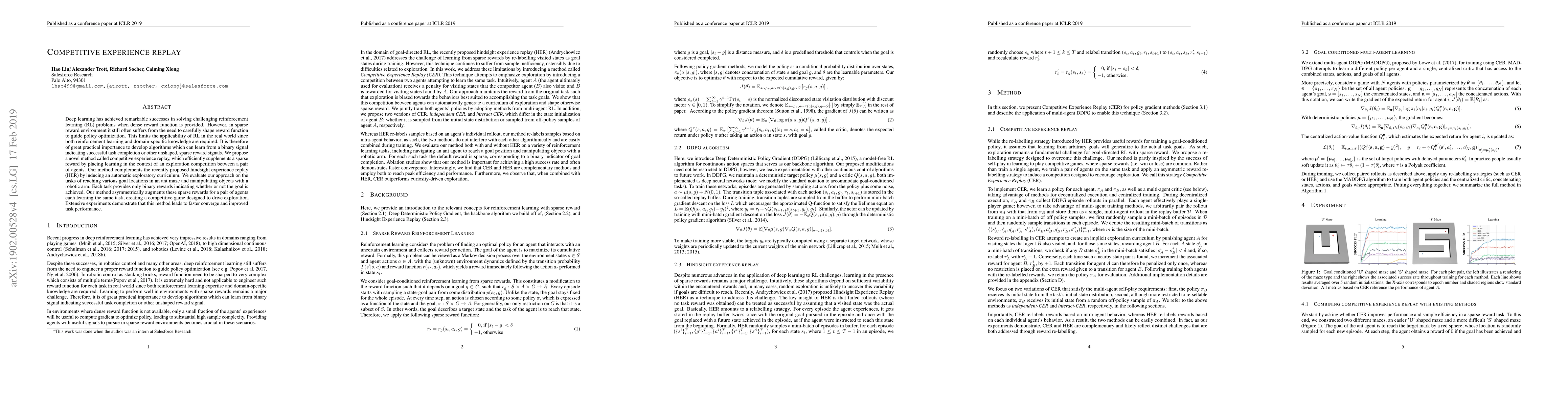 Competitive Experience Replay proposes a novel method to enhance deep reinforcement learning in sparse reward environments by simulating an exploration competition between two agents. This approach effectively augments sparse rewards and leads to faster convergence and improved task performance in tasks like navigating mazes and manipulating objects.
