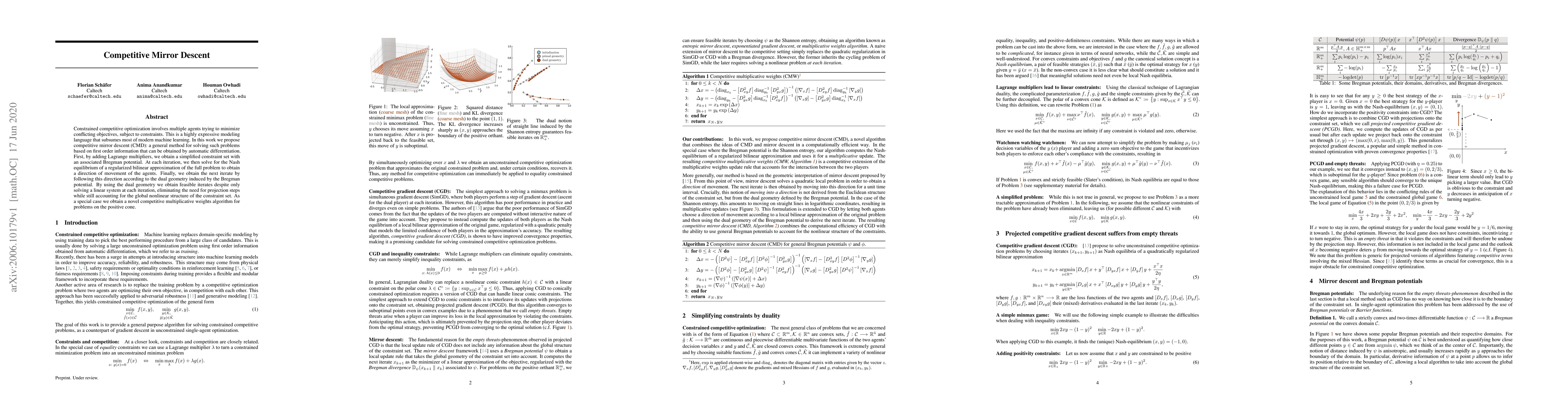 This paper introduces Competitive Mirror Descent (CMD), a new method for solving multi-agent optimization problems with conflicting goals and constraints, using geometry-aware updates that avoid complex projections. It offers a flexible approach applicable to various machine learning tasks, including a novel multiplicative weights algorithm for positive data.